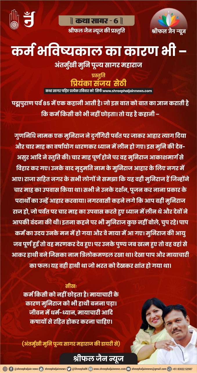 सीख– कर्म किसी को नहीं छोड़ता है। मायाचारी के कारण मुनिराज को भी हाथी बनना पड़ा। जीवन में धर्म-ध्यान, मायाचारी आदि कषायों से रहित होकर करना चाहिए।