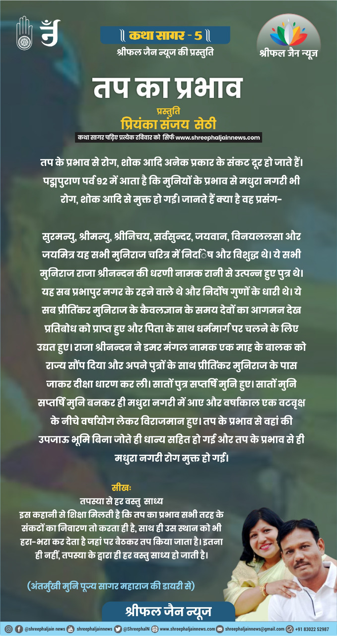तप के प्रभाव से रोग, शोक आदि अनेक प्रकार के संकट दूर हो जाते हैं। पद्मपुराण पर्व 92 में आता है कि मुनियों के प्रभाव से मधुरा नगरी भी रोग, शोक आदि से मुक्त हो गई। जानते हैं क्या है वह प्रसंग-
