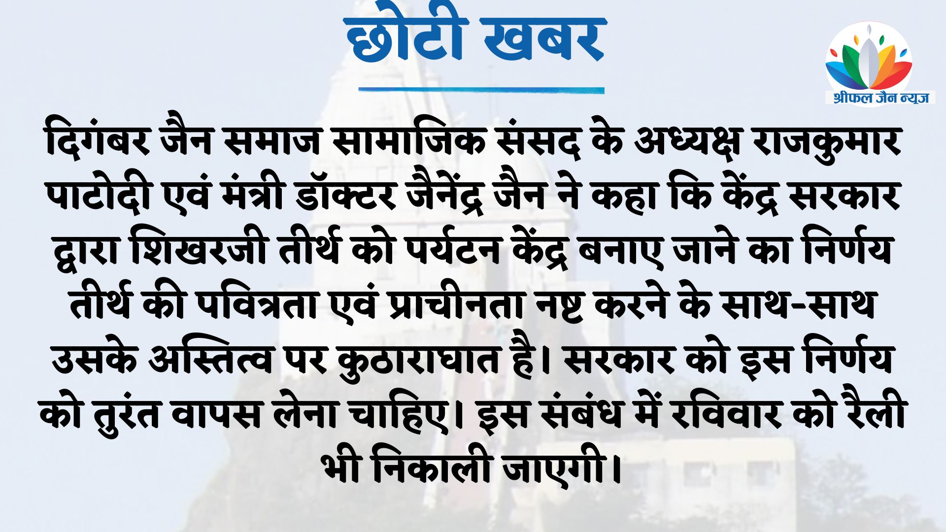 यह निर्णय अहिंसक और अल्पसंख्यक जैन समुदाय की भावनाओं को आहत करने वाला भी है। अतः इस निर्णय को तुरंत वापस लिया जाए। उन्होंने बताया कि इस संबंध में दिगंबर जैन समाज सामाजिक संसद के प्रतिनिधिमंडल ने इंदौर के सांसद शंकर लालवानी से भी भेंट कर उन्हें निर्णय के विरोध एवं निर्णय वापस लेने के संबंध में एक ज्ञापन भी दिया है। पाटोदी ने समग्र जैन समाज से आह्वान किया कि शिखरजी सहित सभी पुरातन जैन तीर्थ हमारी संस्कृति की ऐतिहासिक धरोहर हैं, इनसे ही हमारी जैन संस्कृति की प्राचीनता और इतिहास का पता चलता है।