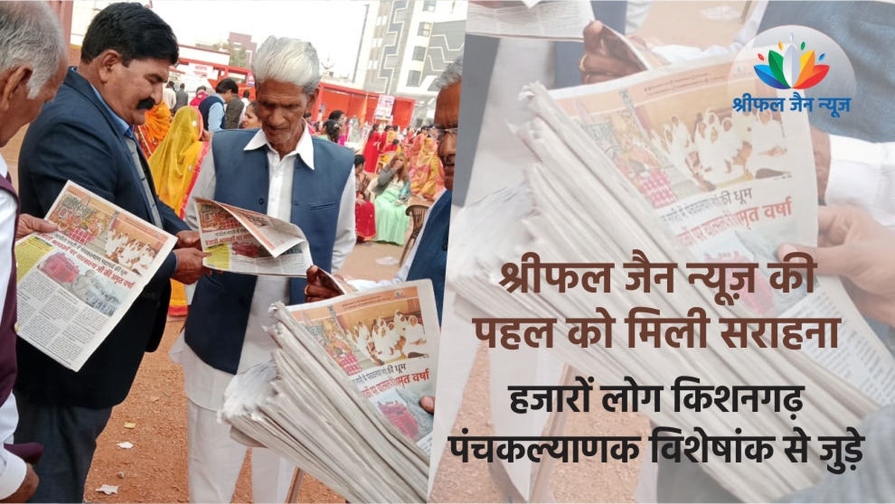किशनगढ़ में पंचकल्याणक महोत्सव की व्यापक कवरेज कर रहे आपके श्रीफल जैन न्यूज़ ने आज किशनगढ़ में कार्यक्रम स्थल पर पंचकल्याण महोत्सव से जुड़ी महत्वपूर्ण खबरों और जैन संस्कृति से जुड़ी जानकारियों को अखबार के एक विशेषांक में समेट कर लाया । जैसे ही आयोजन स्थल पर श्रीफल जैन न्यूज़ का समाचार पत्र आया, जैन श्रावकों ने इसे हाथों-हाथ लिया और प्रकाशित की गई हजारों प्रतियां भी कम पढ़ गई ।