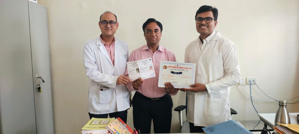 डूंगरपुर। महावीर इंटरनेशनल के इंटरनेशनल डायरेक्टर नॉलेज शेयरिंग एवं ई-चौपाल अजीत कोठिया को देहदान के लिए प्रेरक कार्यों और 15 लोगों को मरणोपरांत देहदान आवेदन में सहयोग के लिए एनाटोमी विभाग, आयुर्विज्ञान महाविद्यालय डूंगरपुर द्वारा सम्मानित किया गया। एनाटोमी विभागाध्यक्ष डॉ. हितेश बाबेल एवं डॉ. अजय परमार प्रोफेसर एमडी ने कोठिया को सम्मानित करते हुए उनके देहदान प्रेरक कार्यों की मुक्त कंठ से सराहना की। कोठिया को दोनों ने 12 देहदान घोषणा करने वाले भाई बहनों के सर्टिफिकेट तथा हाल ही में देहदान की घोषणा है चुके रेयाना निवासी विनोद पंचाल और उनकी धर्म पत्नी अनीता पंचाल के कार्ड भी भेंट किए। इस अवसर पर महावीर इंटरनेशनल की ई चौपाल में डॉ. हितेश बाबेल एवं डॉ अजय परमार द्वारा मरणोपरांत देहदान पर विशेष जानकारियां साझा करने के लिए दोनों ही चिकित्सकों का कोठिया ने आभार व्यक्त किया। इस अवसर पर डॉ बाबेल ने सभी नागरिकों से मरणोपरांत देहदान की घोषणा कर पीड़ित मानवता सेवा में समर्पण का आह्वान किया।