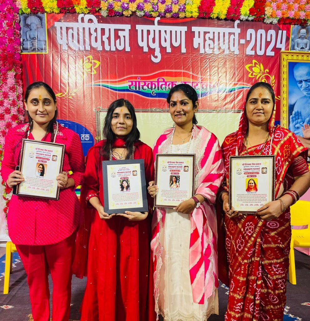 आज प्रातः दस लक्षण व्रतधारी प्रसम सेठी, अक्षय गंगवाल, नमन सेठी, सदर अस्पताल में कार्यरत डॉक्टर चेलना सेठी, एकांत विनायका, ऋषभ काला, अंकित ठोलिया, तनीषा छाबड़ा, ममता सेठी और रत्नत्रय धारी व्रतियों का स्वागत अभिनंदन प्रतीक चिन्ह सम्मान पत्र देकर जैन समाज के पदाधिकारियों ने किया। महिला समाज ने सभी व्रतधारियों का पारणा करवाया। संध्या में भगवान की शांति धारा और विश्व शांति मत्रों से युक्त लॉन्ग की माला और आरती करने का सौभाग्य अनिल, मनोज कमल, पिंकी कासलीवाल परिवार को मिला। रक्षा कासलीवाल को चांदी की माला समाज के पदाधिकारी ने पहनाया। समाज के लोगों ने उन्हें उनके घर चांडक परिसर तक बैंड बाजे के साथ घर तक पहुंचाया। प्रातः सभी व्रतधारियों के व्रत की अनुमोदना के लिए बैंड बाजे के द्वारा उनके घर पहुंचाया गया।