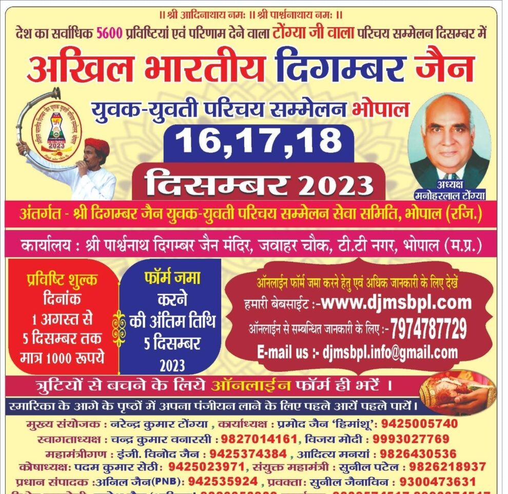 अखिल भारतीय दिगंबर जैन समाज का टोंग्या जी वाला परिचय सम्मेलन परिचय सम्मेलन 16,17,18 दिसम्बर को भोपाल में आयोजित होने जा रहा है। पढ़िए यह रिपोर्ट…