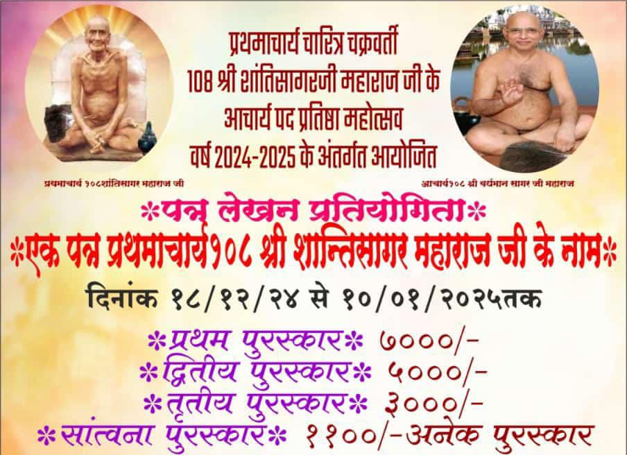 प्रथमाचार्य श्री शांतिसागर जी महाराज के आचार्य पद प्रतिष्ठा महोत्सव (वर्ष 2024-2025) के अंतर्गत आयोजित पत्र लेखन प्रतियोगिता का आयोजन किया जा रहा है। इस प्रतियोगिता में भाग लेने का अवसर सभी को दिया जा रहा है। पढ़िए राजेश पंचोलिया की रिपोर्ट…