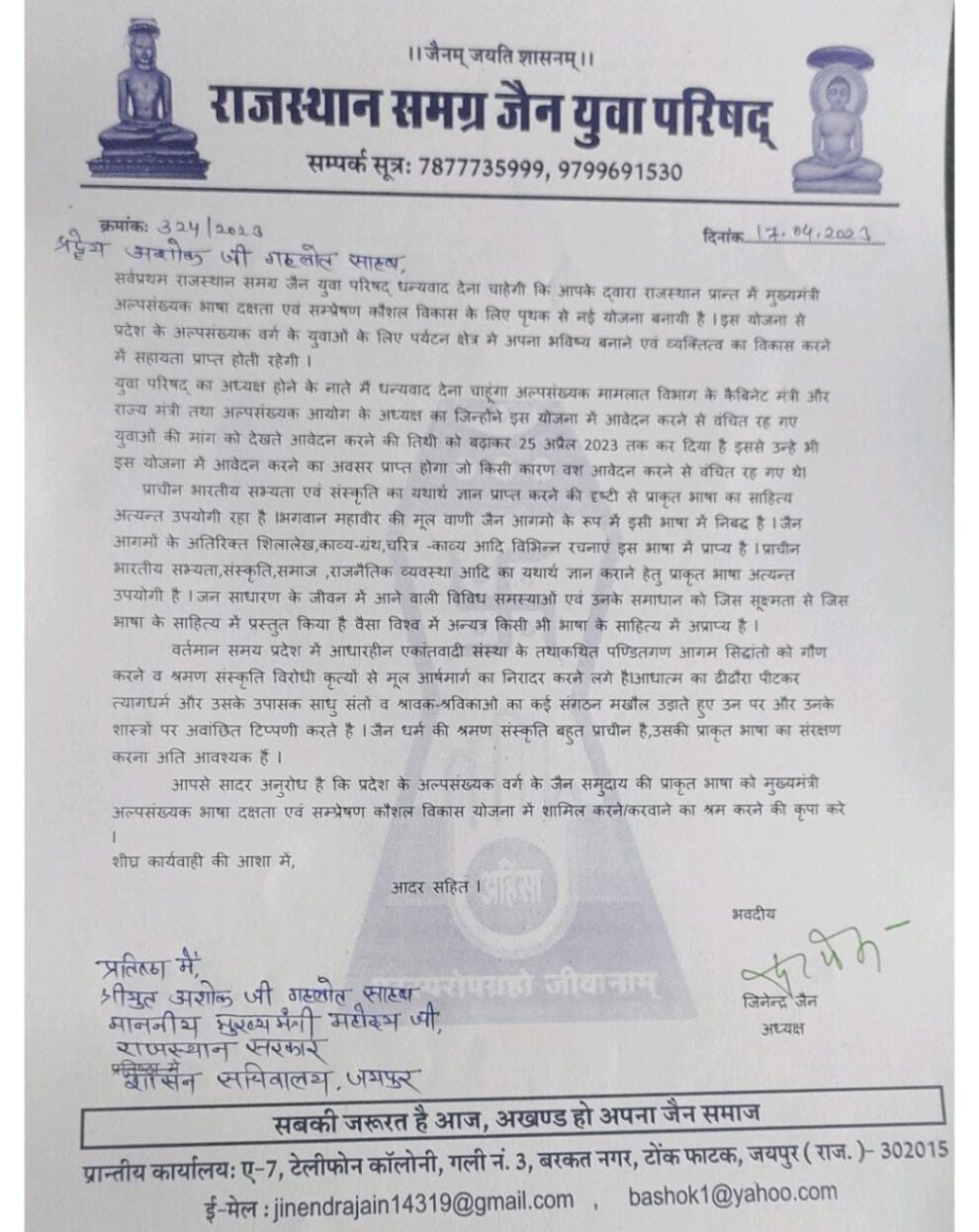 राजस्थान प्रदेश के अल्पसंख्यक वर्ग के जैन समुदाय की प्राकृत भाषा को मुख्यमंत्री अल्पसंख्यक भाषा दक्षता एवं सम्प्रेषण कौशल विकास योजना में शामिल कराने के लिए राजस्थान समग्र जैन युवा परिषद् ने मुख्यमंत्री अशोक गहलोत को पत्र लिखकर प्राकृत भाषा को योजना में शामिल कराने की मांग की l पढ़िए जिनेन्द्र जैन की रिपोर्ट…