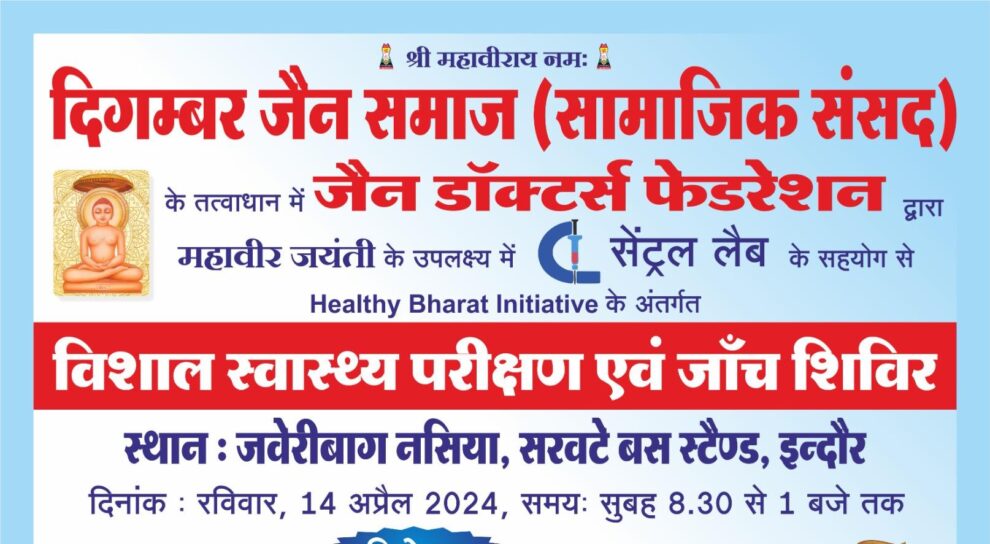 महावीर जन्म कल्याणक के अवसर पर दिगंबर जैन समाज सामाजिक संसद और जैन डाक्टर्स फेडरेशन द्वारा सेंट्रल लेब के सहयोग से एक निशुल्क विशाल स्वास्थ्य परीक्षण शिविर का आयोजन रविवार 14 अप्रैल को किया जाएगा। पढ़िए यह विशेष रिपोर्ट…