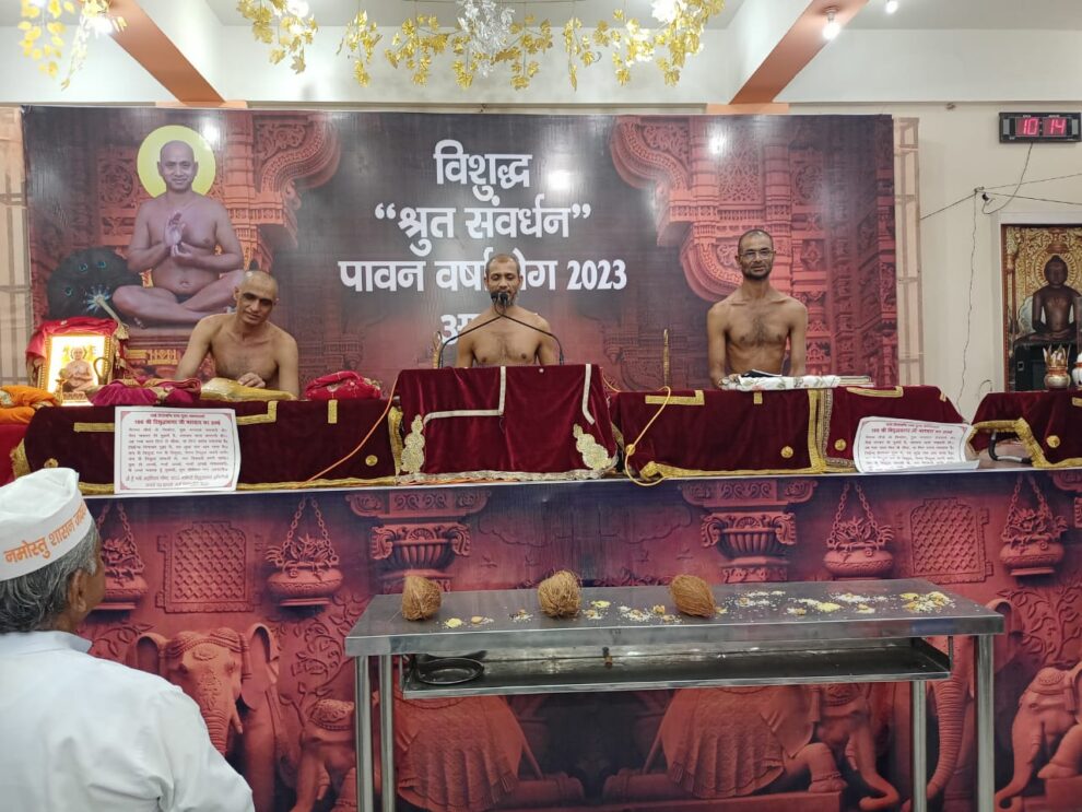 आगरा। निर्मल सेवा सदन छीपीटोला, आगरा में विराजमान आचार्य श्री विशुद्ध सागर जी महाराज के परम् प्रिय शिष्य परम पूज्य मुनि श्री 108 साक्ष्य सागर जी महाराज, मुनि श्री 108 योग्य सागर जी महाराज, मुनि श्री 108 निवृत सागर जी महाराज के सानिध्य में आगरा के इतिहास में पहली बार सिद्ध पुरुष श्री राम कथा पदम पुराण जैन रामायण वाचना हुई l इसके बाद दीप प्रज्वलन, पाद प्रक्षालन, शास्त्र भेंट, मंगलाचरण सहित अनेक धार्मिक कार्यक्रम हुए।
