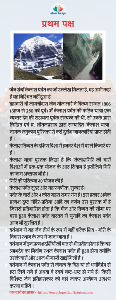 परदेशीपुरा में श्री दिगंबर जैन परदेशीपुरा समाज और दिगंबर जैन सोशल ग्रुप “वीर बाहुबली” द्वारा कैलाश मानसरोवर पर्वत की झांकी सजाई गई है। इसे देखकर ऐसा लगता है मानो वास्तव में कैलाश पर्वत की यात्रा कर रहे हैं। जैन धर्म के अनुसार कैलाश पर्वत भगवान आदिनाथ की निर्वाण स्थली मानी जाती है। इस झांकी के माध्यम से व्यक्ति कैलाश मानसरोवर की पूरी यात्रा करता है और जब पूरी यात्रा हो जाती है, तब वह परदेशीपुरा जैन मंदिर के दर्शन कर वापस निकल आता है। झांकी 13 सितंबर से 19 सितंबर तक जारी रहेगी। क्या कैलाश मानसरोवर जैन तीर्थ स्थल है, इस पर दो पक्ष हैं। पढ़िए श्रीफल जैन न्यूज की संपादक रेखा जैन की विशेष रिपोर्ट..,