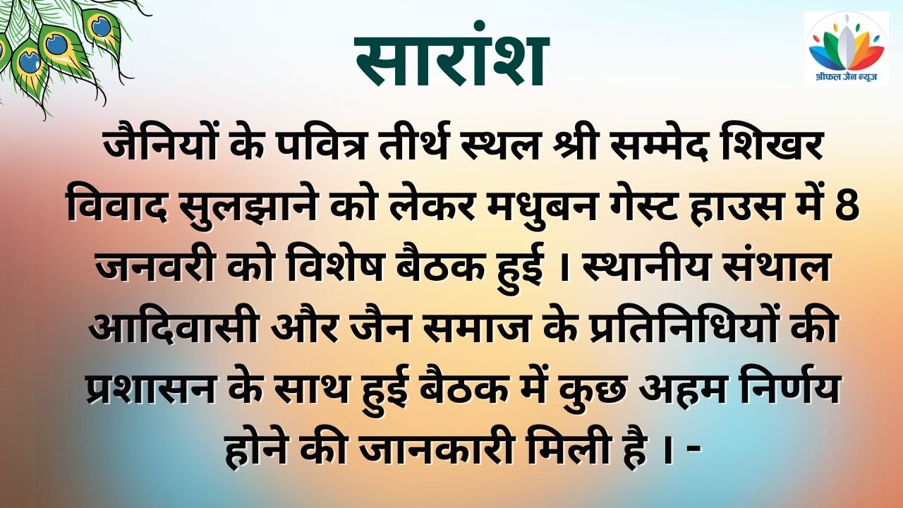श्रीफल जैन न्यूज़ के सूत्रों के मुताबिक बैठक में सहमति बनी कि पूर्व की तरह सभी समुदाय पारसनाथ में सह अस्तित्व की भावना बनाए रखेंगे. जैन समाज को भी अपने तीर्थ स्थल का दर्शन करने में कोई परेशानी न हो ।