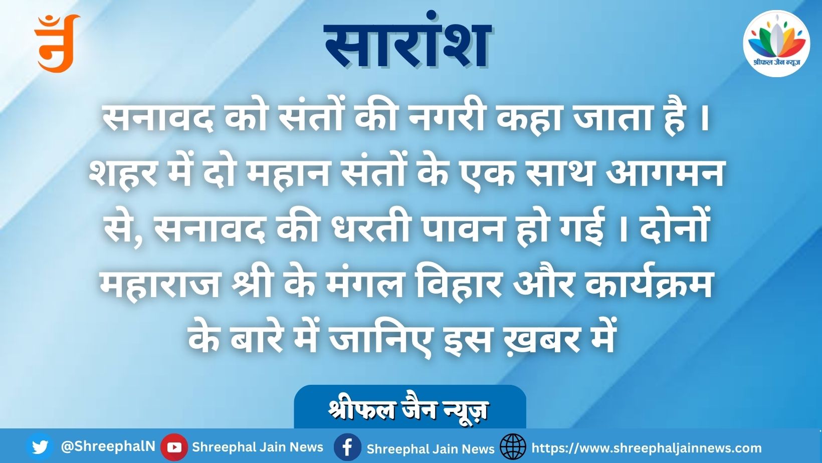 सनावद. सन्मति जैन । संतो की कही जाने वाली नगरी सनावद में संत का आना बहुत सौभाग्यशाली माना जाता है । इसी क्रम में सन्मति जैन काका ने बताया की सनावद नगर में ही जन्मे दो युगल मुनि राज को श्रीफल समर्पित करने 24 सदस्यों का एक दल मलकापुर महाराष्ट्र पहुंचा और आचार्य श्री 108 विद्या सागर जी महाराज के परम प्रभावक शिष्य मुनि श्री 108 प्रयोग सागर जी महाराज एवं मुनि श्री 108 प्रबोध सागर जी महाराज को नगर आगमन हेतु आग्रह किया।