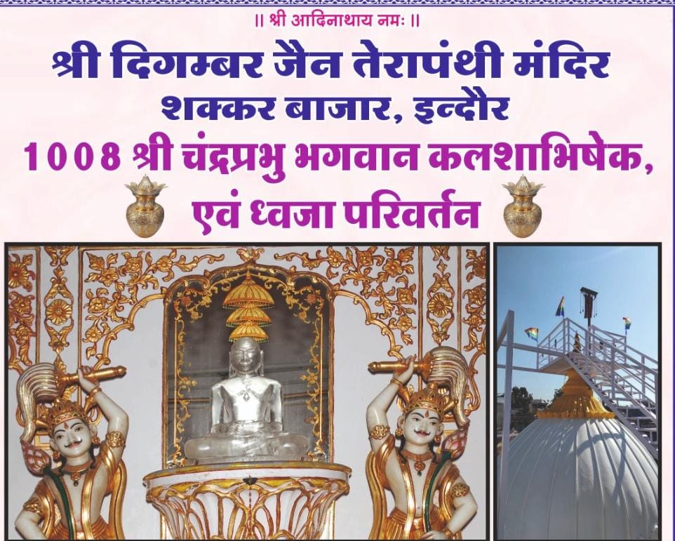 इंदौर। शहर के मध्य शक्कर बाजार में स्थित श्री दिगंबर जैन तेरापंथी मंदिर में प्रति वर्ष अनुसार इस वर्ष भी जैन धर्म के आठवें तीर्थंकर श्री 1008 चंदा प्रभु भगवान के जन्म तप कल्याणक के उपलक्ष्य में पौष वदी ग्यारस रविवार, 7 जनवरी को प्रातः 8:30 बजे श्री चंदा प्रभु मंडल विधान का संगीतमय आयोजन किया जाएगा। इसके पश्चात प्रातः 10:30 बजे से जिनालय में विराजमान अति प्राचीन, मनोज्ञ एवं अतिशय पूर्ण चंदा प्रभु भगवान की स्फटिक मणि की प्रतिमा का स्वर्ण रजत कलशों से महामस्तकाभिषेक होगा।