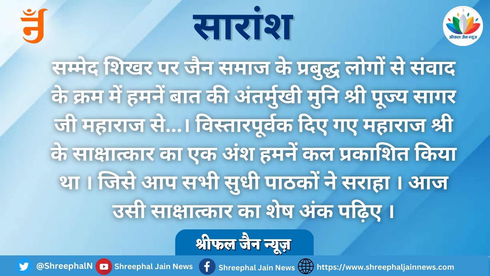 अंतर्मुखी मुनि श्री पूज्यसागर जी महाराज – जैन समुदाय आजीविका और आध्यात्मिकता दोनों के लिए जाना जाता है । मेरा निजी मत है कि सम्मेद शिखर के आस-पास सरकार और जैन समाज को पूरे जैन मय माहौल बनाना चाहिए ।