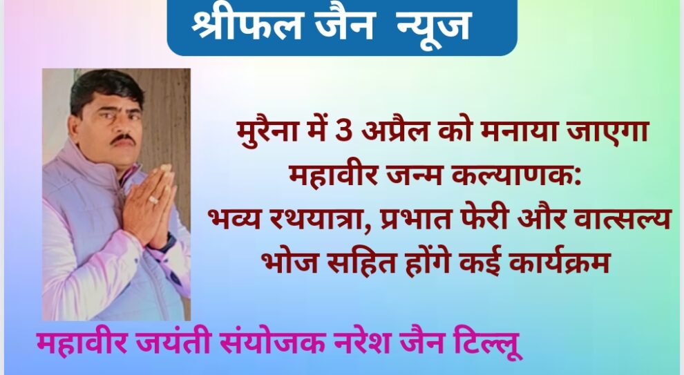 श्री पार्श्वनाथ दिगम्बर जैन पंचायती बड़ा मन्दिर कमेटी मुरैना के उपाध्यक्ष अभिषेक जैन टीटू (आलोक प्रेस) की ओर से दी गई जानकारी के अनुसार विगत वर्षों की भांति इस वर्ष भी जैन धर्म के 24वें तीर्थंकर भगवान महावीर स्वामी का जन्म कल्याणक महोत्सव तीन अप्रैल को मनाया जाएगा । गत दिवस आयोजन की रूपरेखा बनाने के लिए श्री प्रेमचंद जैन (बन्दना साड़ी) की अध्यक्षता में सकल जैन समाज मुरैना की आम पंचायत बुलाई गई जिसमें नरेश जैन टिल्लू (गढ़ी वाले) को संयोजक मनोनीत किया गया। आम पंचायत के निर्णयानुसार इस बार महावीर जयंती के चल समारोह में बाजारू झांकियों को सम्मिलित नहीं किया जाएगा। जैन धर्म के सिद्धांतों पर आधारित झांकियां स्वयं ही तैयार की जाएगी।