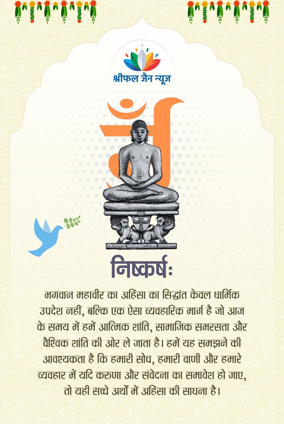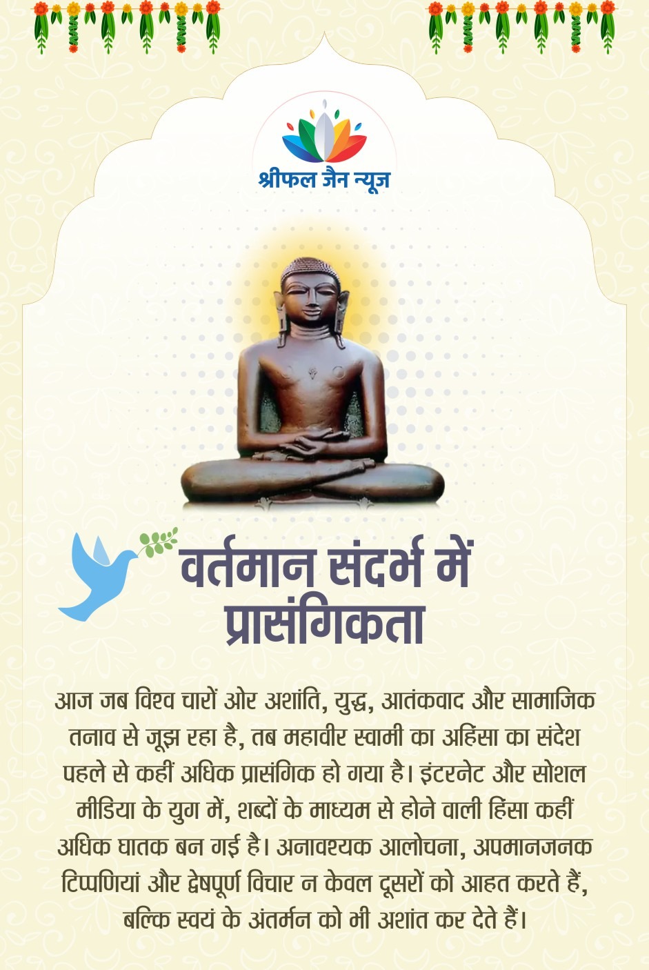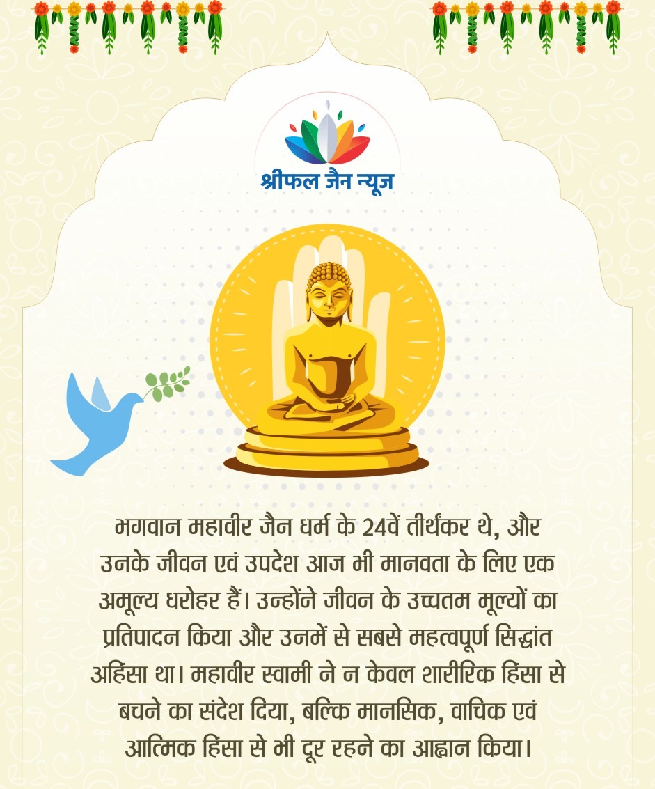 भगवान महावीर स्वामी का अहिंसा का सिद्धांत केवल शारीरिक हिंसा से बचने तक सीमित नहीं है, बल्कि यह विचार, वाणी और व्यवहार की पवित्रता पर आधारित एक जीवनदृष्टि है। वर्तमान समय की सामाजिक अशांति और मानसिक तनाव के बीच, यह सिद्धांत आंतरिक शांति, सहानुभूति और सामाजिक समरसता के लिए अत्यंत प्रासंगिक है। अहिंसा को आत्मिक जागरूकता और करुणा के रूप में अपनाकर हम व्यक्तिगत और सामाजिक सुधार की दिशा में अग्रसर हो सकते हैं। पढ़िए महावीर जयंती पर श्रीफल जैन न्यूज की संपादक रेखा संजय जैन का विशेष आलेख….