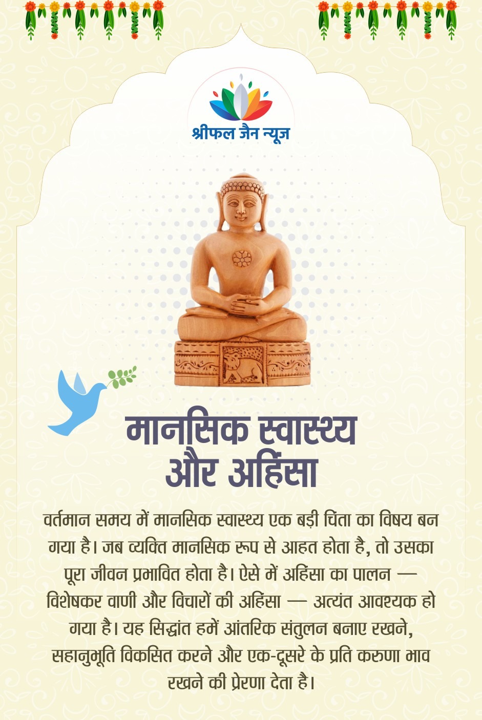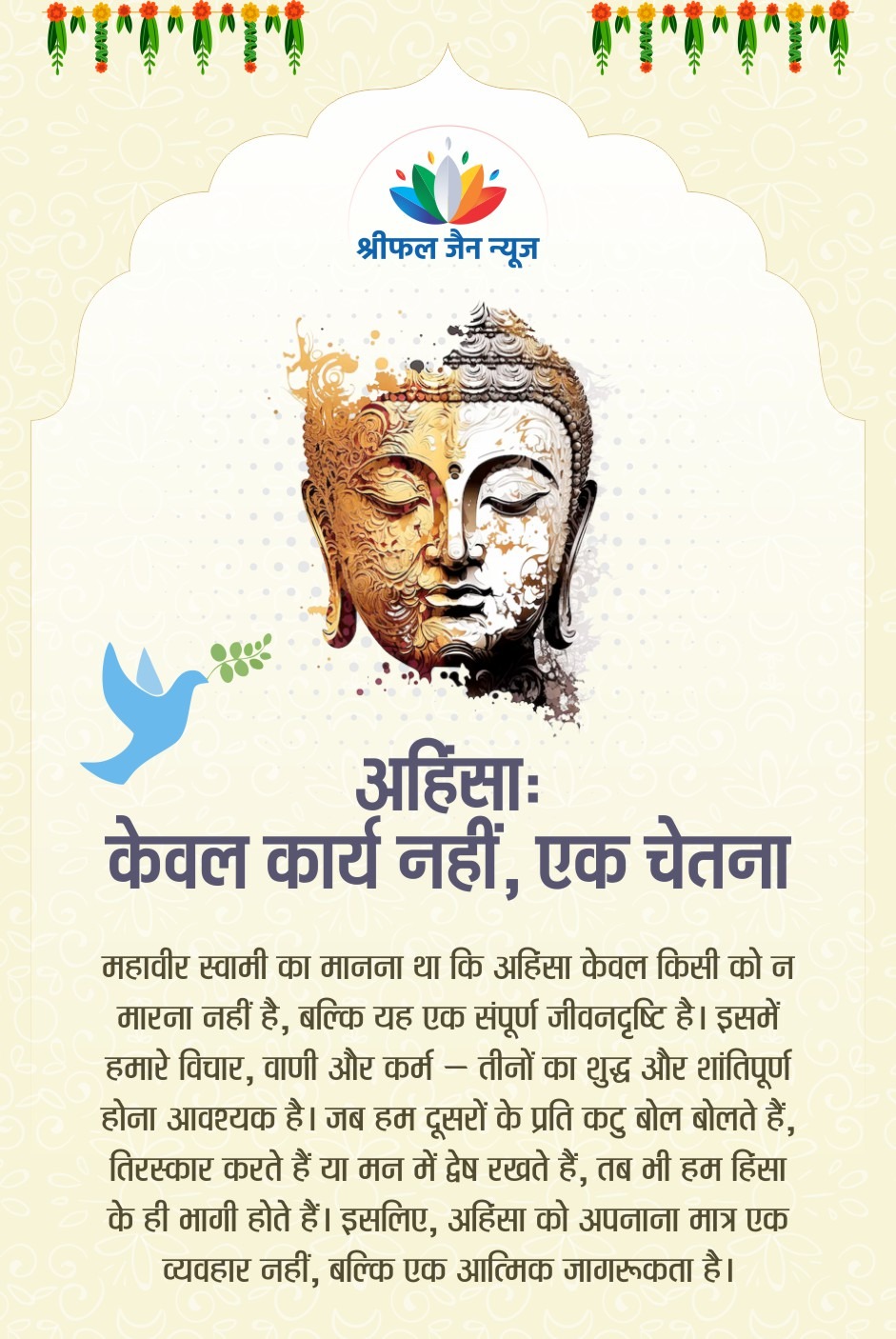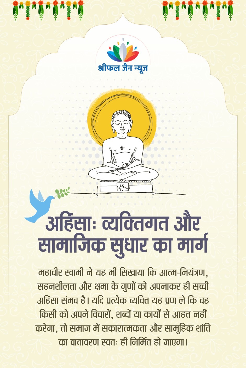 भगवान महावीर स्वामी का अहिंसा का सिद्धांत केवल शारीरिक हिंसा से बचने तक सीमित नहीं है, बल्कि यह विचार, वाणी और व्यवहार की पवित्रता पर आधारित एक जीवनदृष्टि है। वर्तमान समय की सामाजिक अशांति और मानसिक तनाव के बीच, यह सिद्धांत आंतरिक शांति, सहानुभूति और सामाजिक समरसता के लिए अत्यंत प्रासंगिक है। अहिंसा को आत्मिक जागरूकता और करुणा के रूप में अपनाकर हम व्यक्तिगत और सामाजिक सुधार की दिशा में अग्रसर हो सकते हैं। पढ़िए महावीर जयंती पर श्रीफल जैन न्यूज की संपादक रेखा संजय जैन का विशेष आलेख….