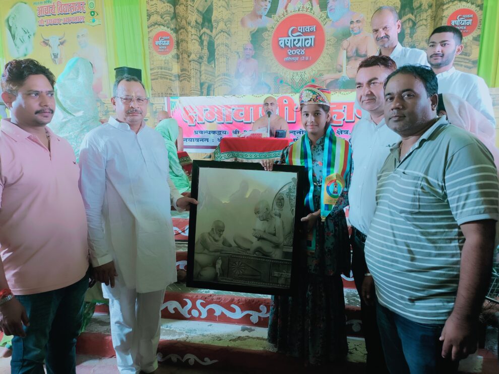 ललितपुर(राजीव सिंघई मोनू)। आचार्य श्रेष्ठ विद्यासागर महाराज एवं सुधा सागर महाराज की तस्वीर को माही जैन में पेंसिल से स्क्रैच करके आकृति को बनाया। अभिनंदनोदय तीर्थक्षेत्र पर दया भावना फाउंडेशन के प्रेरणास्रोत मुनिश्री अविचल सागर महाराज के पावन सानिध्य में आयोजित क्षमावाणी पर्व के कार्यक्रम में दिगम्बर जैन पंचायत समिति के पदाधिकारियों ने बेटी दिवस के अवसर पर माही जैन को सम्मानित किया।