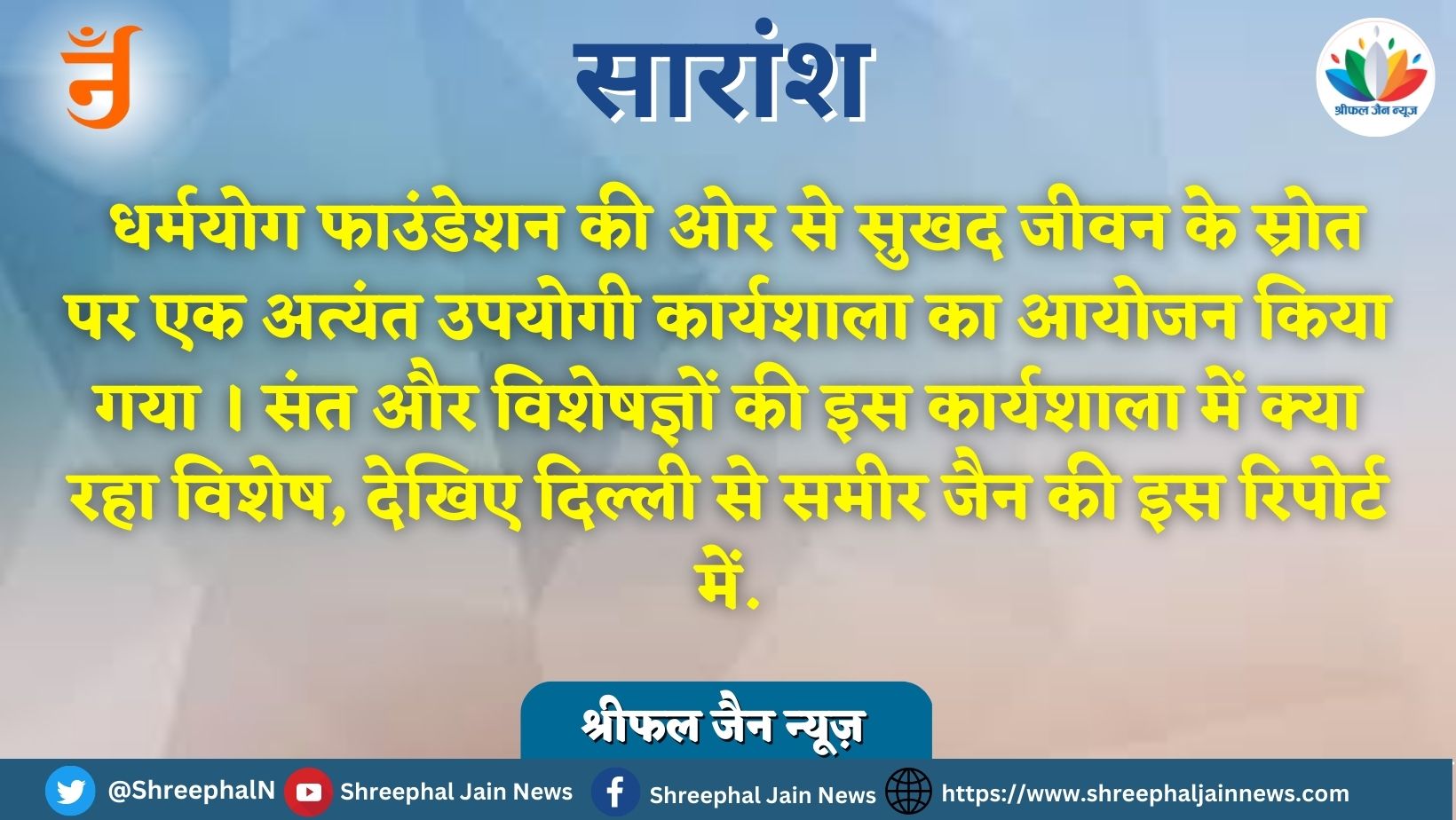 समीर जैन- परम श्रद्धेय, ध्यान प्रज्ञ, मंत्र महर्षि, धर्मयोगी संत डॉ. श्री योग भूषण जी महाराज के सान्निध्य में दिनांक 25 दिसम्बर 2022 को मुक्तधारा सभागार, गोल मार्केट (दिल्ली) में कार्यशाला आयोजित की गई । कार्यशाला का शुभारंभ महामंत्र णमोकार के उच्चारण से हुआ।