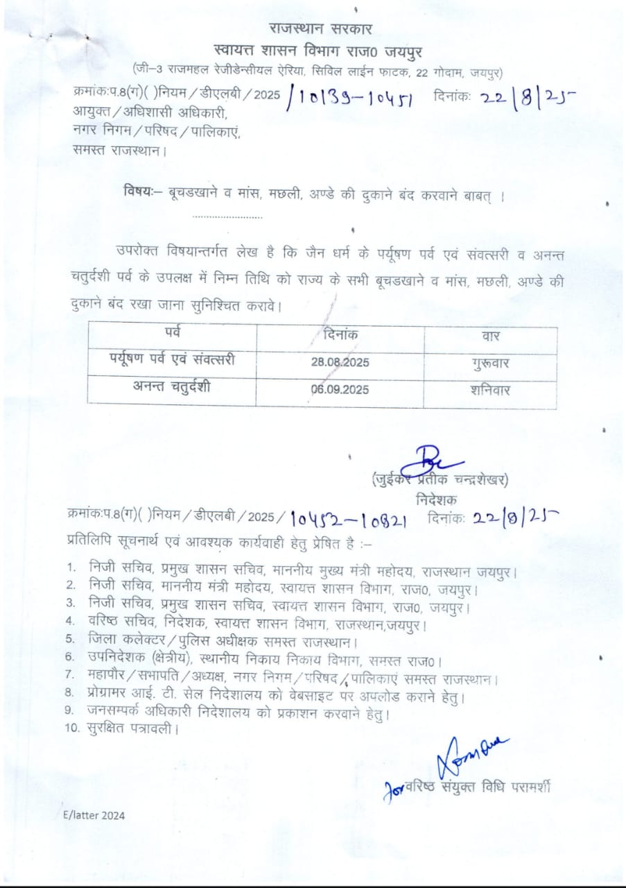 जयपुर: अल्पसंख्यक वर्ग के जैन समुदाय के पर्यूषण पर्व के प्रारम्भ एवं संवत्सरी 28 अगस्त गुरुवार तथा वैदिक संस्कृति और श्रमण संस्कृति के प्रमुख त्यौहार अनंत चतुर्दशी 6 सितम्बर शनिवार के उपलक्ष्य में हर वर्ष की भांति राजस्थान सरकार द्वारा राज्य के सभी बूचड़खाने व मांस, मछली, अण्डे की दुकानें बंद रखने के आदेश जारी किये गए हैं।