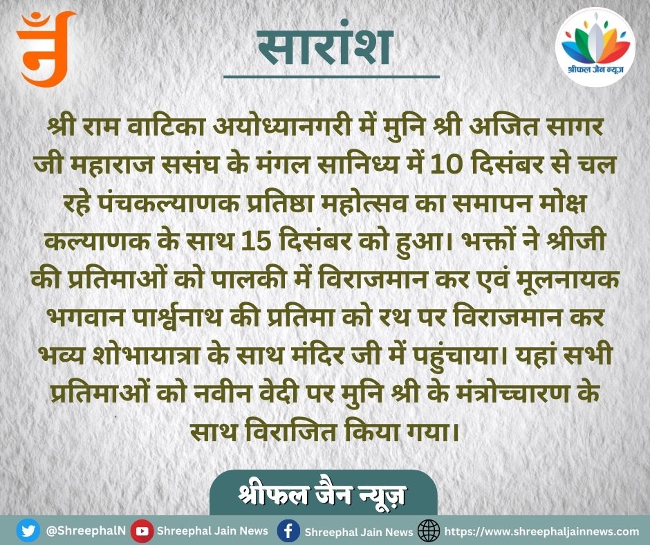 आगरा (शुभम जैन)। राहुल विहार स्थित चमरौली रोड के श्री राम वाटिका अयोध्यानगरी में मुनि श्री अजित सागर जी महाराज ससंघ के मंगल सानिध्य में 10 दिसंबर से चल रहे पंचकल्याणक प्रतिष्ठा महोत्सव का समापन मोक्ष कल्याणक के साथ 15 दिसंबर को हुआ।
