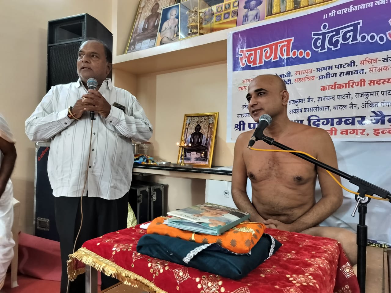 इससे पहले कार्यक्रम की शुरुआत दीप प्रज्वलन और मंगलाचरण से हुई। पाद प्रक्षालन दिगम्बर जैन पार्श्वनाथ पंचायत मंदिर अंजनी नगर की कमेटी के अध्यक्ष देवेंद्र सोगानी, उपाध्याय ऋषभ पाटनी, मंत्री संजय मोदी एवं राजेश काला, चंद्रकुमार गोधा, हेमंत गदिया, राजकुमार जैन, नितिन पाटोदी, अंकित जैन और अंशुल जैन ने किया। मंगलाचरण योगेन्द्र पंडित और मंजुला डोसी ने किया। शास्त्र भेंट पिंकी कासलीवाल और मुनि श्री की गृहस्थ जीवन की भतीजी ध्वनि जैन ने किया। धर्म सभा का संचालन समाज के उपाध्यक्ष ऋषभ पाटनी ने किया। आभार नितिन पाटोदी ने व्यक्त किया। सभा में सकल जैन समाज के लोग मौजूद रहे। मदिर कमेटी की ओर से आगामी अष्टानिका महापर्व में विधान के लिए मुनि श्री को श्रीफल भेंट किया गया। उन्होंने अपने सानिध्य के लिए सहमति भी प्रदान की। इसके बाद मुनि श्री का दोपहर में स्मृति नगर के लिए विहार हो गया।