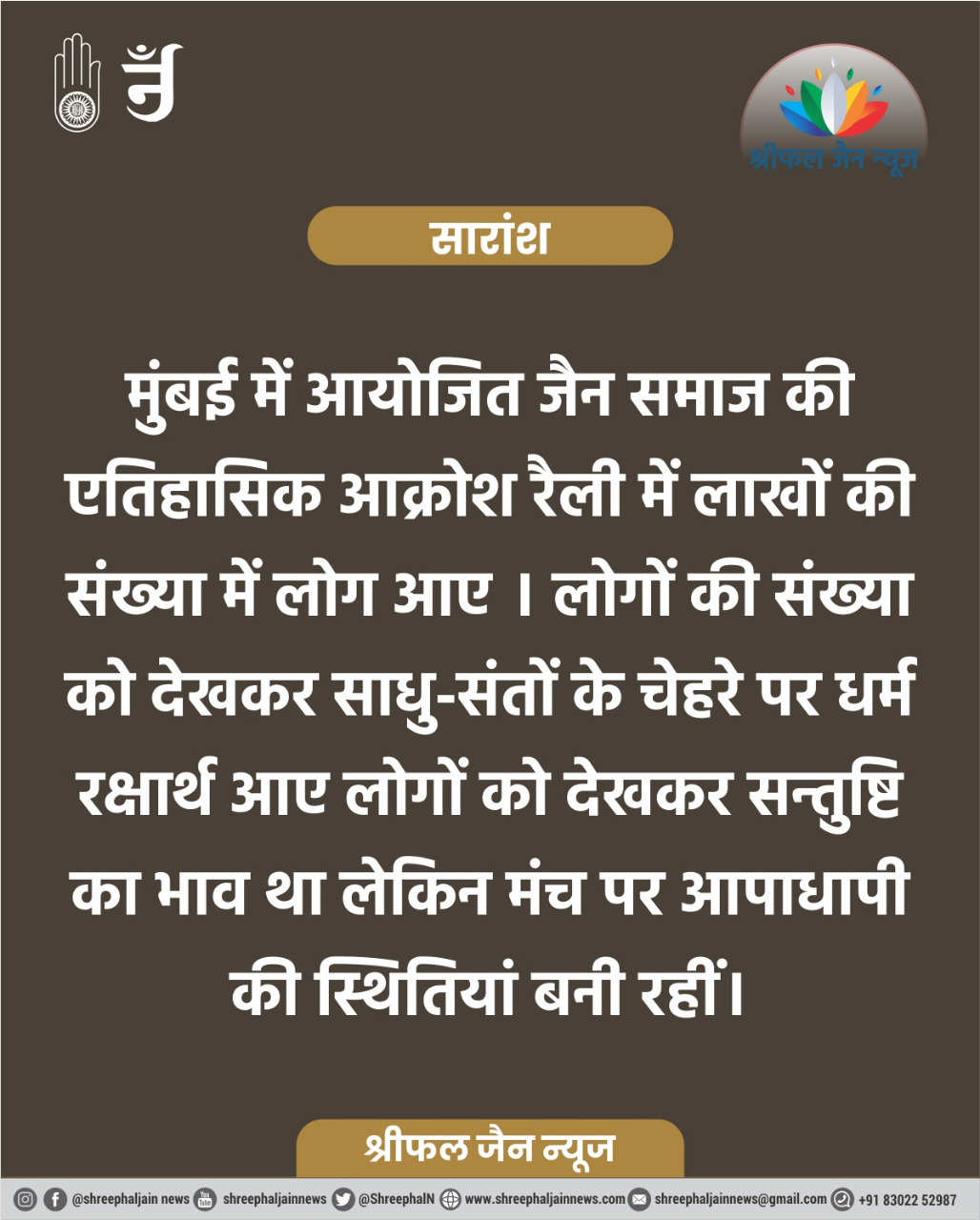 मुंबई में आयोजित जैन समाज की एतिहासिक आक्रोश रैली में लाखों की संख्या में लोग आए । लोगों की संख्या को देखकर साधु-संतों के चेहरे पर धर्म रक्षार्थ आए लोगों को देखकर सन्तुष्टि का भाव था लेकिन मंच पर आपाधापी की स्थितियां बनी रही । मुंबई आयोजन में कई बार मंच पर से साधु-संतों को लोगों से बार-बार कहना पड़ा कि मंच पर ज्यादा लोग न आएं अन्यथा जहां साधु-संत बैठे हैं वो मंच गिर भी सकता है । कई बार उलाहना दी गई कि क्या आप लोग चाहते हैं कि आपके गुरुजन जिस मंच पर बैठे हैं वो गिर जाए ? कार्यक्रम में संचालन कार्य में भी अव्यवस्थाएं देखी गई । मंच पर उद्घोषणा करने वाले प्रमुख व्यक्ति की जगह बोलने आए मेहमानों ने अपनी और से वक्ताओं के नाम बुलाने शुरु कर दिए ।
