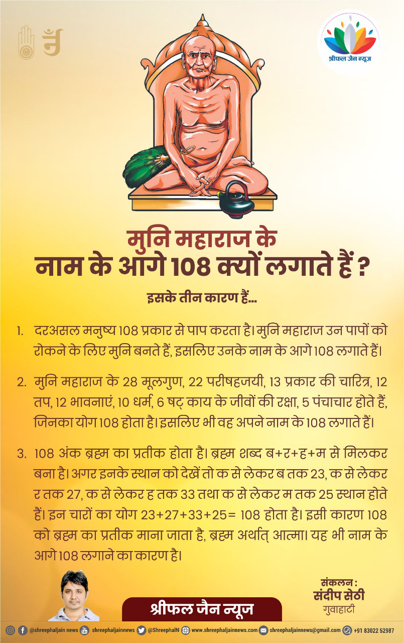 1. दरअसल मनुष्य 108 प्रकार से पाप करता है। मुनि महाराज उन पापों को रोकने के लिए मुनि बनते हैं, इसलिए उनके नाम के आगे 108 लगाते हैं।
