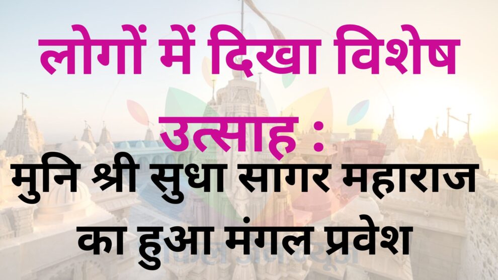आगरा। मुनि पुंगव श्री 108 सुधा सागर जी महाराज जी, क्षुल्लक श्री गंभीर सागर जी महाराज जी का मंगल प्रवेश सी.टी.वी मानस नगर, शाहगंज से पश्चिमपुरी के जैन मंदिर में हुआ। महाराज श्री शाहगंज से बोदला से सेक्टर 4 जैन मन्दिर, सेक्टर 7 जैन मंदिर से सेक्टर 9 कैला देवी होते कारगिल चौराहा से पश्चिमपुरी जैन मंदिरर में भव्य जुलूस के साथ पहुंचे।