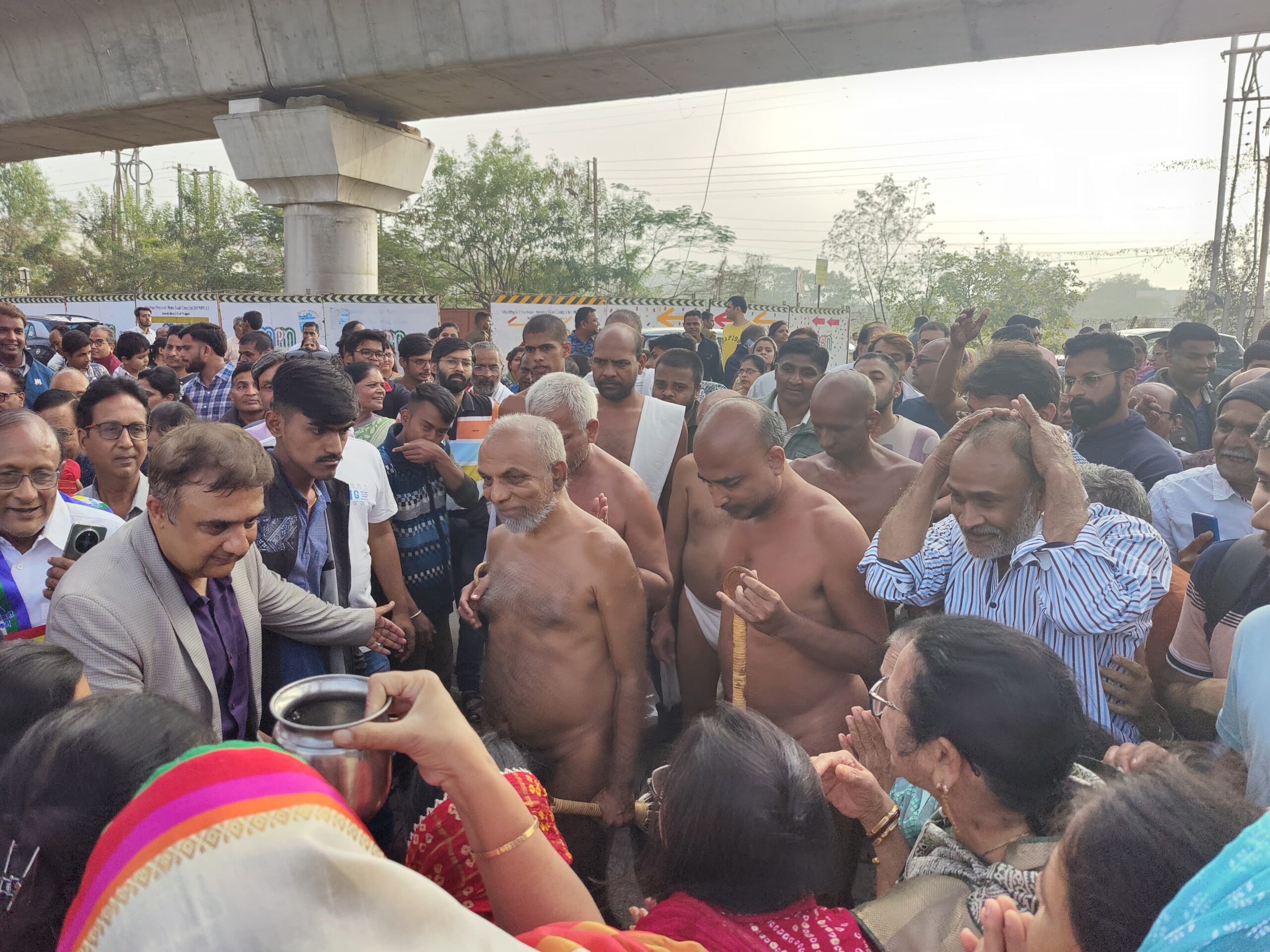मुनिश्री के वृद्धों के बीच पहुंचने के दृश्य ने सभी भक्तों को भावविभोर कर दिया। इसके बाद मुनिश्री ग्रेटर बाबा की ओर प्रस्थान कर गए। एयरपोर्ट चौराहे पर मुनिश्री पूज्य सागर जी के सानिध्य और नरेंद्र वेद के नेतृत्व में मुनिश्री की आगवानी की गई।