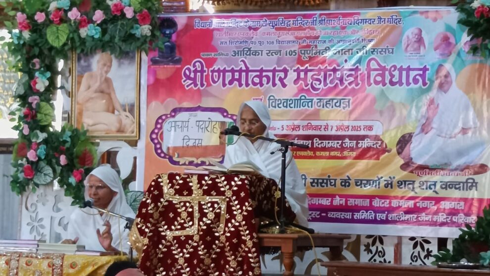 आर्यिका श्री पूर्णमति माताजी ससंघ के मंगल सानिध्य में स्थानीय कमला नगर स्थित श्री पार्श्वनाथ दिगंबर जैन मंदिर में णमोकार महामंत्र विधान और विश्व शांति महायज्ञ हो रहा है। रविवार को भक्तों ने आर्यिका श्री पूर्णमति माताजी के मुखारविंद से मंत्रोच्चार के साथ प्रभु पार्श्वनाथ की शांतिधारा की। श्रीजी के समक्ष मांडले पर श्रीफल अर्पित किए। माताजी का आशीर्वाद लिया। आगरा से पढ़िए शुभम जैन की खबर…