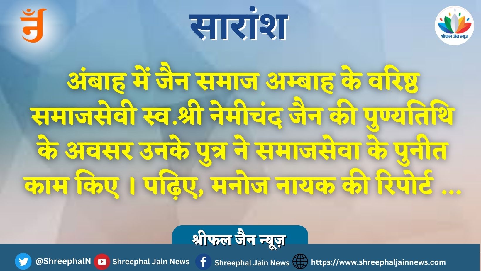 पुण्यतिथि के अवसर पर आयोजित श्रद्धांजलि सभा में स्वर्गीय नेमीचंद जैन का पुण्य स्मरण कर उन्हें श्रद्धांजलि अर्पित की गई । फल वितरण के इस कार्यक्रम में नगर निरीक्षक जितेंद्र नगाइच, डॉक्टर सुधीर आचार्य, केशव शर्मा पंडित जी, अजय जैन पत्रकार, सोनू गोयल, महेंद्र सखवार, हर्ष जैन, विशाल जैन, दीपक जमहोरिया सहित अनेककों समाजसेवी मौजूद थे ।