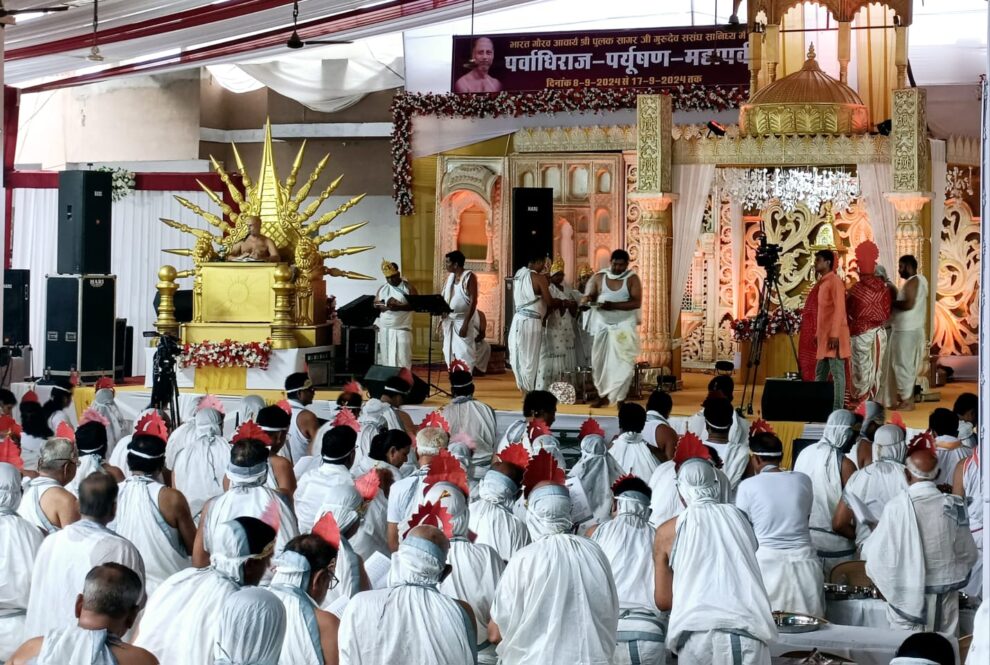 खैरवाड़ा। ऋषभदेव नगर के दिगम्बर जैन भट्टारक यशकीर्ति गुरुकुल में राजकीय अतिथि आचार्य पुलक सागर जी गुरुदेव के सानिध्य में पर्युषण पर्व में 10 दिवसीय पाप विनाशक शिविर का आयोजन चल रहा है, जिसके दूसरे दिन आज उत्तम मार्दव पर्व मनाया गया। दिगम्बर जैन दशा नरसिंहपुरा समाज के निर्माण मंत्री एवं शिविर संयोजक नरेंद्र किकावत एवं पुलक मंच के सक्रिय सदस्य चंद्र प्रकाश भानावत ने बताया कि शिविर में सैकडों लोगों ने भाग लिया। शिविरार्थी सुबह 6 बजे गुरुकुल प्रांगण में पहुंच गए। तत्पश्चात गुरुदेव के सानिध्य में सभी शिविरार्थियों को कुछ देर तक योग और मेडिटेशन करवाया गया। उसके बाद संगीतमय और भक्तिमय माहौल में गुरुदेव द्वारा शिविरार्थियों को धार्मिक पूजा अर्चना महा शांतिधारा करवाई गई। जिसका लाभ इंदौर निवासी पारस जैन परिवार को प्राप्त हुआ। आज के राजा भरत चक्रवर्ती बनने का सौभाग्य भी पारस जैन इंदौर परिवार को प्राप्त हुआ।