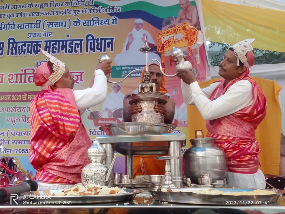 शमशाबाद रोड स्थित राहुल विहार के श्री पार्श्वनाथ दिगंबर जैन पंचायती मंदिर में 20 नवंबर से गणिनी आर्यिकाश्री आर्षमति माताजी ससंघ के मंगल सानिध्य में अष्टाह्निका महापर्व के अवसर पर श्री सिद्धचक्र महामंडल विधान एवं विश्व शांति महायज्ञ का आयोजन किया जा रहा है। विधान के तीसरे दिन सौभाग्यशाली भक्तों ने बड़े भक्ति भाव से संगीतमय श्रीजी की पूजा अर्चना की और भक्ति रस में लीन नजर आए। पढ़िए शुभम जैन की रिपोर्ट….