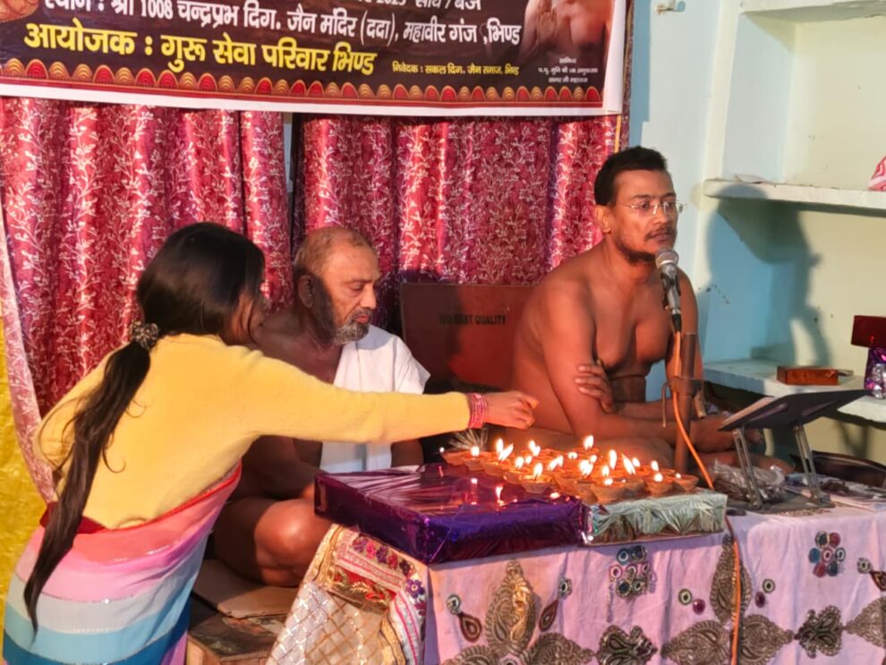 भिंड। नगर के महावीर गंज में स्थित श्री चंद्राप्रभु जैन मंदिर दद्दा वाले में विराजमान आचार्यश्री अभिनंदन सागर महाराज जी के शिष्य बालमुनि श्री अनुकरण सागर जी महाराज ससंघ सानिध्य में उपस्थित श्रद्धालुओं ने रविवार शाम को 7 से रात 9 बजे तक भगवान पदम प्रभु चालीसा का पाठ दीप अर्चना के साथ किया।