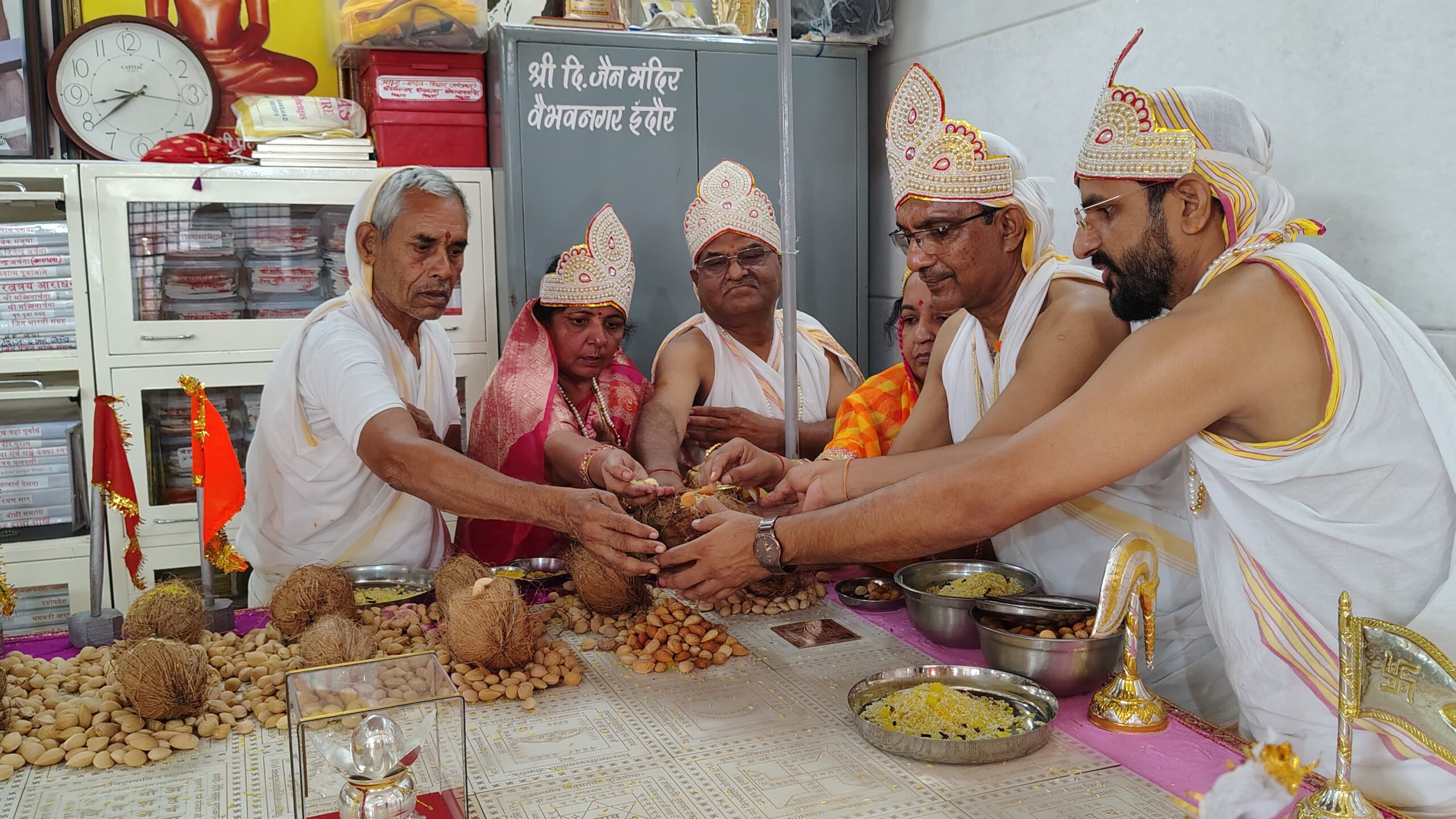 इंदौर। अंतर्मुखी मुनि श्री पूज्य सागर महाराज के धर्म प्रभावना रथ का पांचवां पड़ाव श्री 1008 पदम प्रभु दिगंबर जैन मंदिर, वैभव नगर में चल रहा है। इस कार्यक्रम के अंतर्गत 12 दिवसीय वृहद भक्तामर महामंडल विधान का आयोजन किया जा रहा है। विधान के चौथे दिन, मुख्य पुण्यार्जक पी.सी. सुषमा, राहुल, तृप्ति जैन परिवार और 12 दिवसीय सौधर्म इन्द्र संजय सीमा जैन ने भक्तामर काव्य के 13, 14, 15 और 16 काव्य की आराधना करते हुए कुल 224 अर्घ्य समर्पित किए।