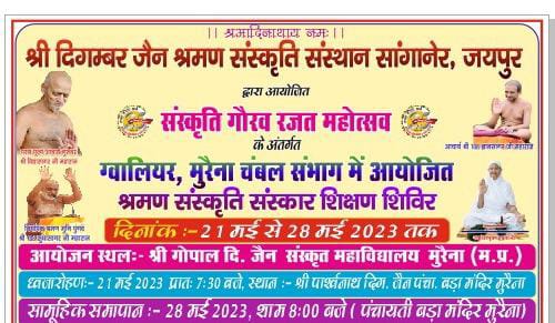 मुरैना। श्रमण संस्कृति संस्कार शिक्षण शिविरों का आठ दिवसीय आयोजन 21 मई से 28 मई तक संस्कृत महाविद्यालय में होने जा रहा है। शिविर के क्षेत्रीय प्रभारी पंडित नवनीत शास्त्री, मुरैना ने बताया कि बच्चों को धार्मिक शिक्षा देने एवं संस्कारों का बीजारोपण करने के उद्देश्य से परम् पूज्य सन्त शिरोमणी आचार्य श्री विद्यासागर जी महाराज के मंगल आशीर्वाद एवं मुनिपुंगव श्री सुधासागर जी महाराज की पावन प्रेरणा से श्री दिगम्बर जैन श्रमण संस्कृति संस्थान सांगानेर जयपुर द्वारा आयोजित संस्कृति गौरव रजत महोत्सव के अंतर्गत 21 मई से 28 मई 2023 तक ग्वालियर एवं चम्बल सम्भाग के विभिन्न शहरों में ग्रीष्मकालीन शिविरों का आयोजन एक साथ होने जा रहा है।
