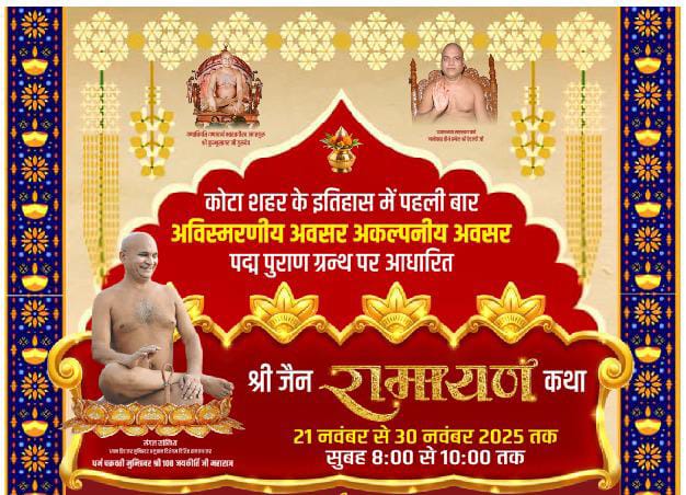कोटा में पहली बार पद्म पुराण पर आधारित जैन रामायण कथा का विराट आयोजन 21 से 30 नवंबर तक अकलंक स्कूल रामपुरा में होगा। जैन रामकथाकार ध्यान दिवाकर धर्म चक्रवर्ती 108 श्री जयकीर्ति जी गुरुदेव इस आयोजन का दिव्य वाचन करेंगे। कार्यक्रम में प्रतिदिन चार विशेष पत्रों का चयन होगा और अनेक सामाजिक-धार्मिक हस्तियां उपस्थित रहेंगी। पढ़िए पारस जैन ‘पार्श्वमणि’ की रिपोर्ट…