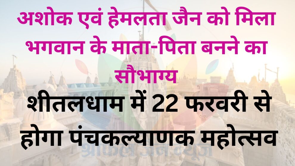 इंदौर। जैन तीर्थ शीतलधाम में आगामी 22 फरवरी से 26 फरवरी तक होने वाले श्री पंचकल्याणक महोत्सव की तैयारी बड़े जोर-शोर से चल रही है। पाषाण से भगवान बनने की प्रक्रिया पंचकल्याणक महोत्सव का जैन धर्म में बड़ा महत्व है। इस महामहोत्सव में भगवान के माता-पिता बनने का सौभाग्य हेमलता अशोक कुमार जैन को प्राप्त हुआ।
