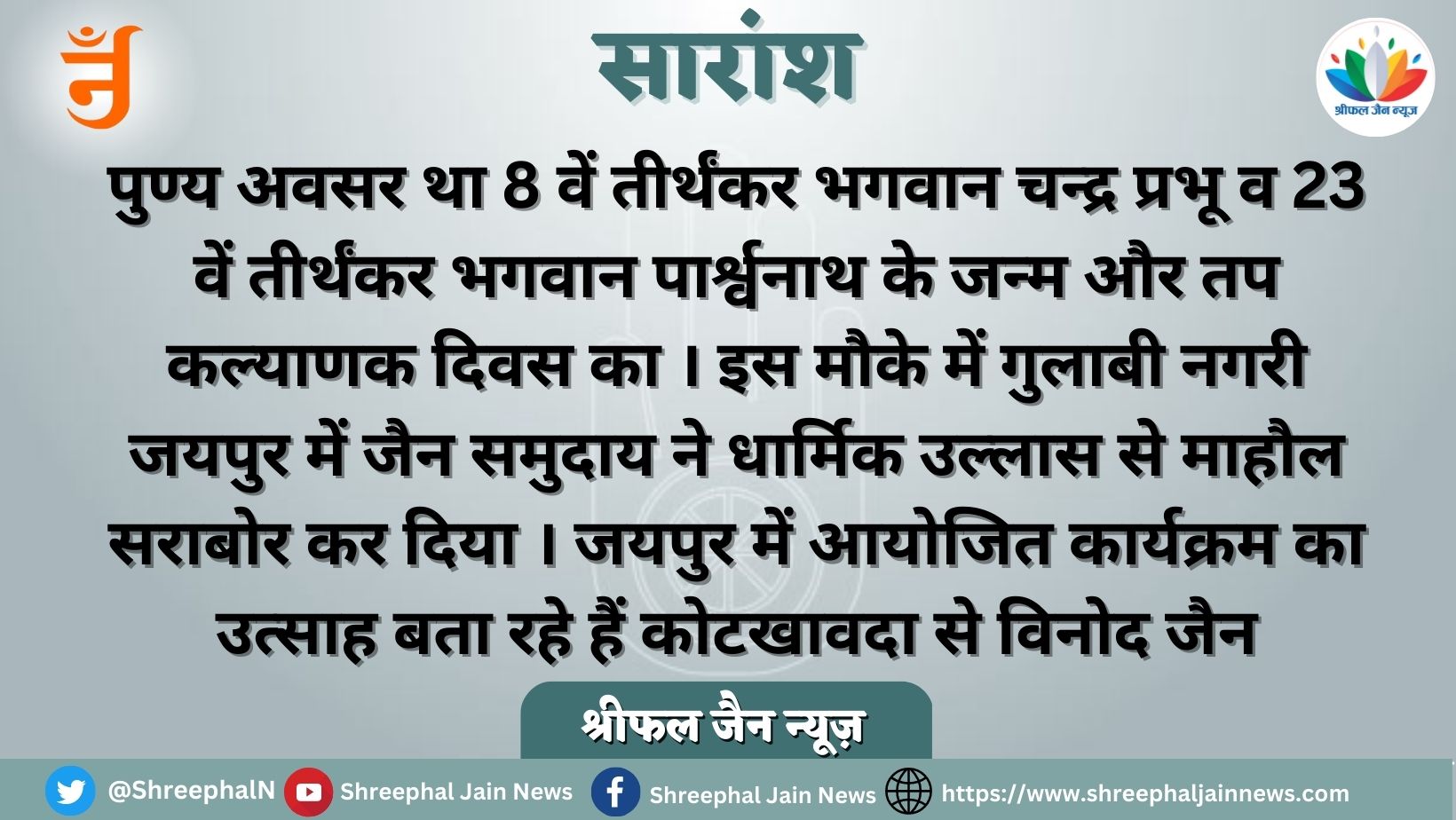 जयपुर. विनोद जैन ‘कोटखावदा’ । आठवें तीर्थंकर भगवान चन्द्र प्रभू एवं 23 वें तीर्थंकर भगवान पार्श्वनाथ का जन्म व तप कल्याणक दिवस सोमवार,19 दिसम्बर को भक्ति भाव से मनाया गया । इस मौके पर शहर के दिगम्बर जैन मंदिरों में पूजा अर्चना के विशेष आयोजन किये गये ।