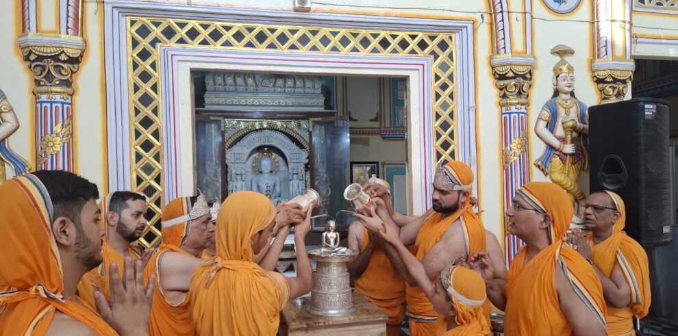 कुचामनसिटी। दिगम्बर जैन नागौरी नसियाजी सब्जी मंडी में जैन समाज द्वारा विश्व में चारों ओर फैली अराजकता को समाप्त करने,आपस भाईचारा कायम करने की भावना से मंगलवार सुबह 31 श्रावकों के साथ कलशाभिषेक किया गया। शादी की 50 वीं वर्षगांठ पर सौधर्म इंद्र ओमप्रकाश किरण देवी झांझरी परिवार ने भगवान आदिनाथ का कलशाभिषेक, शांतिधारा, सगीतमय शांति विधान किया। वीरेंद्र पहाडिया के सानिध्य में गायक गौरव, खुशबू पाटनी अशोक झाझंरी ने भजनों की प्रस्तुति से भाव विभोर किया।