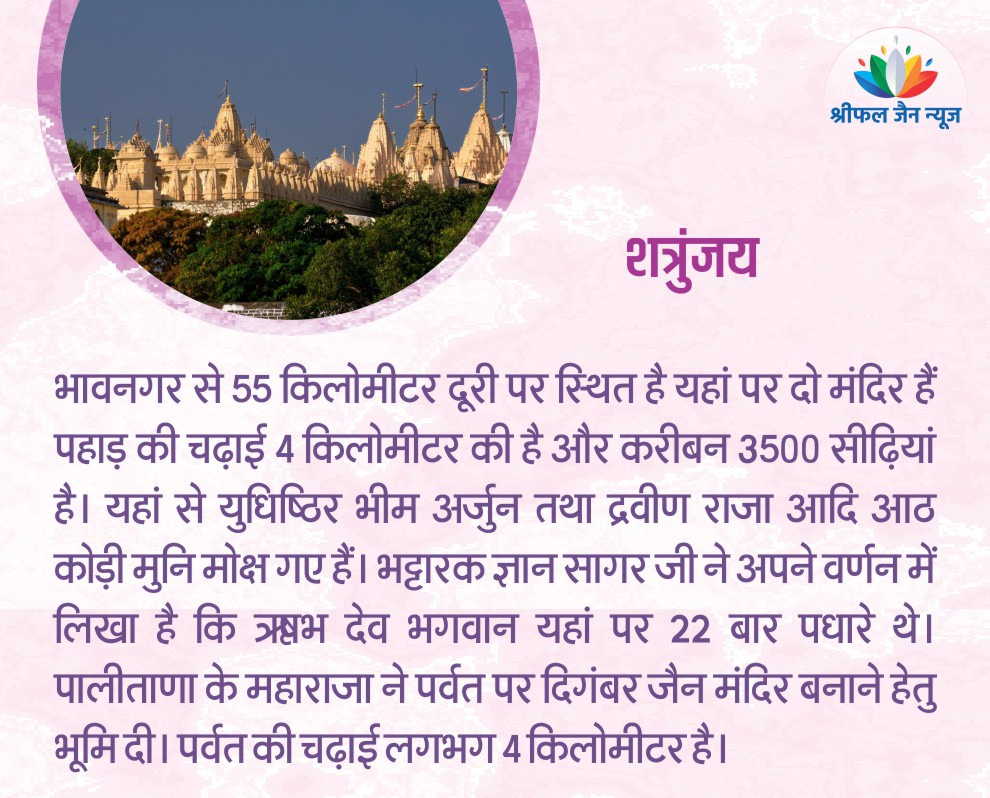 गुजरात में जैन तीर्थ स्थलों में पालीताणा, गिरनार, कोठारा, नलिया, तरंगा और सोनगढ़ जैसे स्थान शामिल है। गुजरात में सबसे सुंदर जैन मंदिर पालीताणा जैन मंदिर है। 3800 से ज्यादा पत्थर की सीढ़ियों के साथ चढ़ाई आसान नहीं है, लेकिन यह हर साल हजारों भक्तों को वहां जाने से नहीं रोक पाता। गुजरात के जैन तीर्थ स्थलों की जानकारी दे रही हैं श्रीफल जैन न्यूज की संपादक रेखा जैन। पढ़िए यह विशेष आलेख….