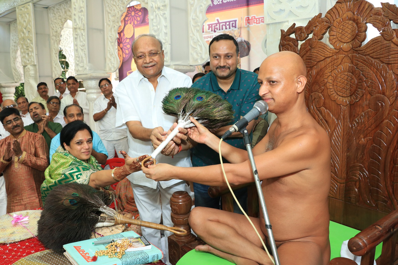 कार्यक्रम के मध्य कमलानगर एवं छीपीटोला की बालिकाओं और महिलाओं ने मनमोहक नृत्य प्रस्तुत किया। भक्तों ने अष्ट द्रव्यों के साथ समाधिस्थ आचार्य श्री विरागसागर जी महाराज, आचार्य शिरोमणि आचार्य श्री विशुद्ध सागर जी महाराज और उपाध्यायश्री विहसंतसागर जी महाराज का संगीतमय पूजन किया। इसके बाद, उपाध्यायश्री विहसंतसागर जी महाराज को नवीन पिच्छी अर्पित करने का सौभाग्य पावन वर्षायोग समिति के गौरवाध्यक्ष प्रदीप जैन पीएनसी, अभिनंदन जैन पीएनसी और ईशू जैन पीएनसी परिवार को प्राप्त हुआ, जबकि उपाध्यायश्री की पुरानी पिच्छी मनीष जैन परिवार ने प्राप्त की। मुनिश्री विश्वसौम्य सागर जी महाराज की नवीन पिच्छी देने का सौभाग्य रोहित जैन अहिंसा परिवार को मिला, और मुनिश्री की पुरानी पिच्छी लेने का सौभाग्य विकास जैन कमलानगर परिवार को प्राप्त हुआ।