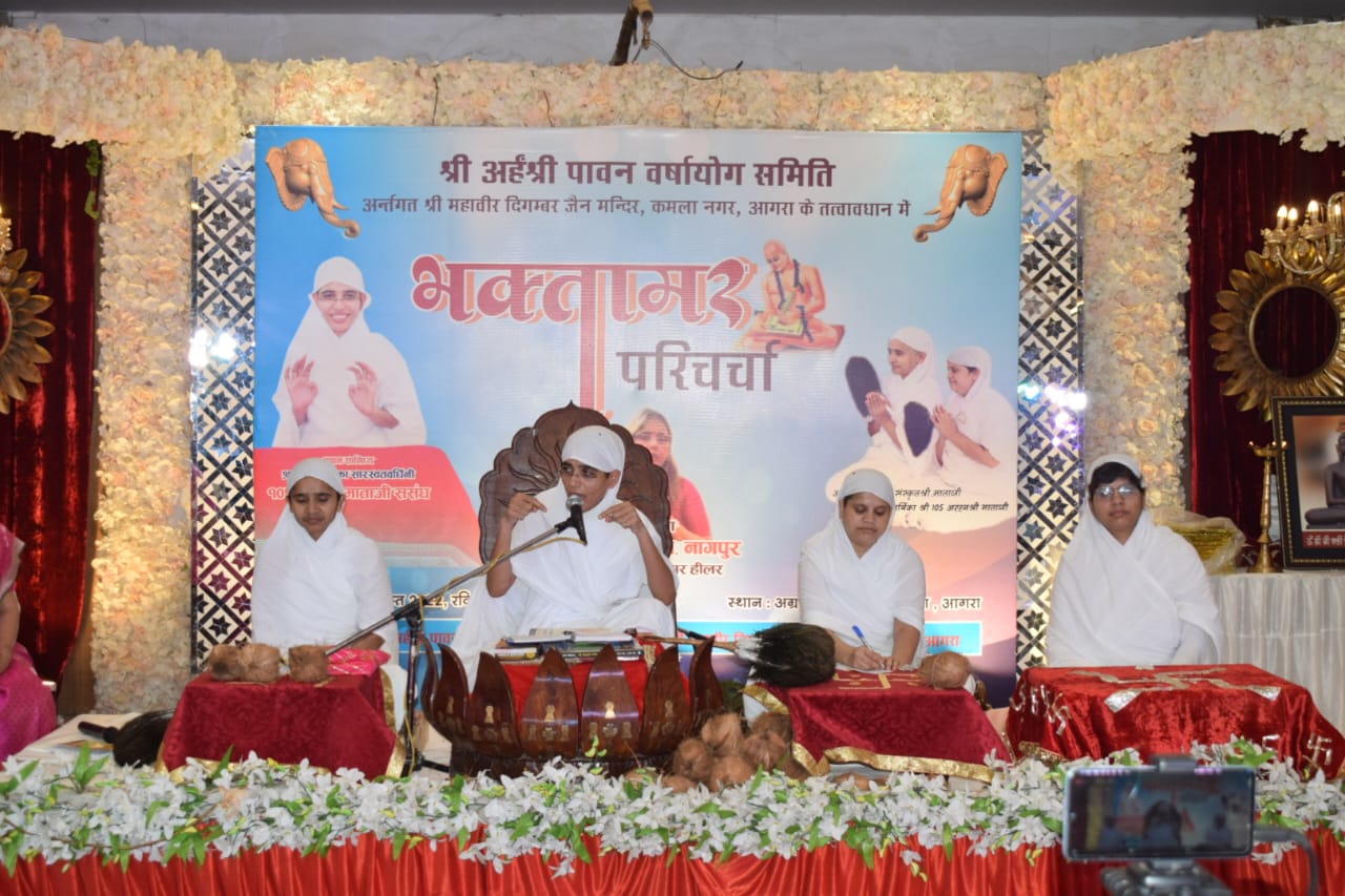 आगरा। रविवार को वाटर वर्क्स चौराहा स्थित अग्रवन भूतल में अर्हंश्री पावन वर्षायोग समिति के द्वारा परम पूज्यनीय आर्यिका श्री 105 अर्हंश्री माताजी ससंघ के सान्निध्य में भक्तामर संगोष्ठी कार्यक्रम का आयोजन किया गया। कार्यक्रम का शुभारंभ चित्र अनावरण एवं दीपप्रज्जवलन के साथ हुआ। इस अवसर पर भक्तों ने माताजी का पाद प्रक्षालन एवं शास्त्र भेंटकर आशीर्वाद प्राप्त किया। इसके बाद देश की ख्याति प्राप्त भक्तामर हीलर श्री मंजू जैन ने सभी भक्तों को भक्तामर पाठ का उपाय बताया।