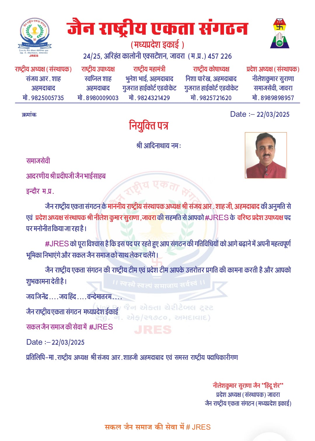 संस्थापक प्रदेश अध्यक्ष (मध्यप्रदेश इकाई) नीलेशकुमार सुराणा जैन ‘हिन्दू शेर’ जावरा ने प्रदीप जैन को जैन राष्ट्रीय एकता संगठन मध्यप्रदेश इकाई का वरिष्ठ उपाध्यक्ष नियुक्त किया है। वरिष्ठ उपाध्यक्ष प्रदीप जैन ने मध्यप्रदेश में जैन राष्ट्रीय एकता संगठन का महत्वपूर्ण उदेश्य सकल जैन समाज को एकजुट करने की प्राथमिकता बताई। पढ़िए इंदौर से यह खबर…