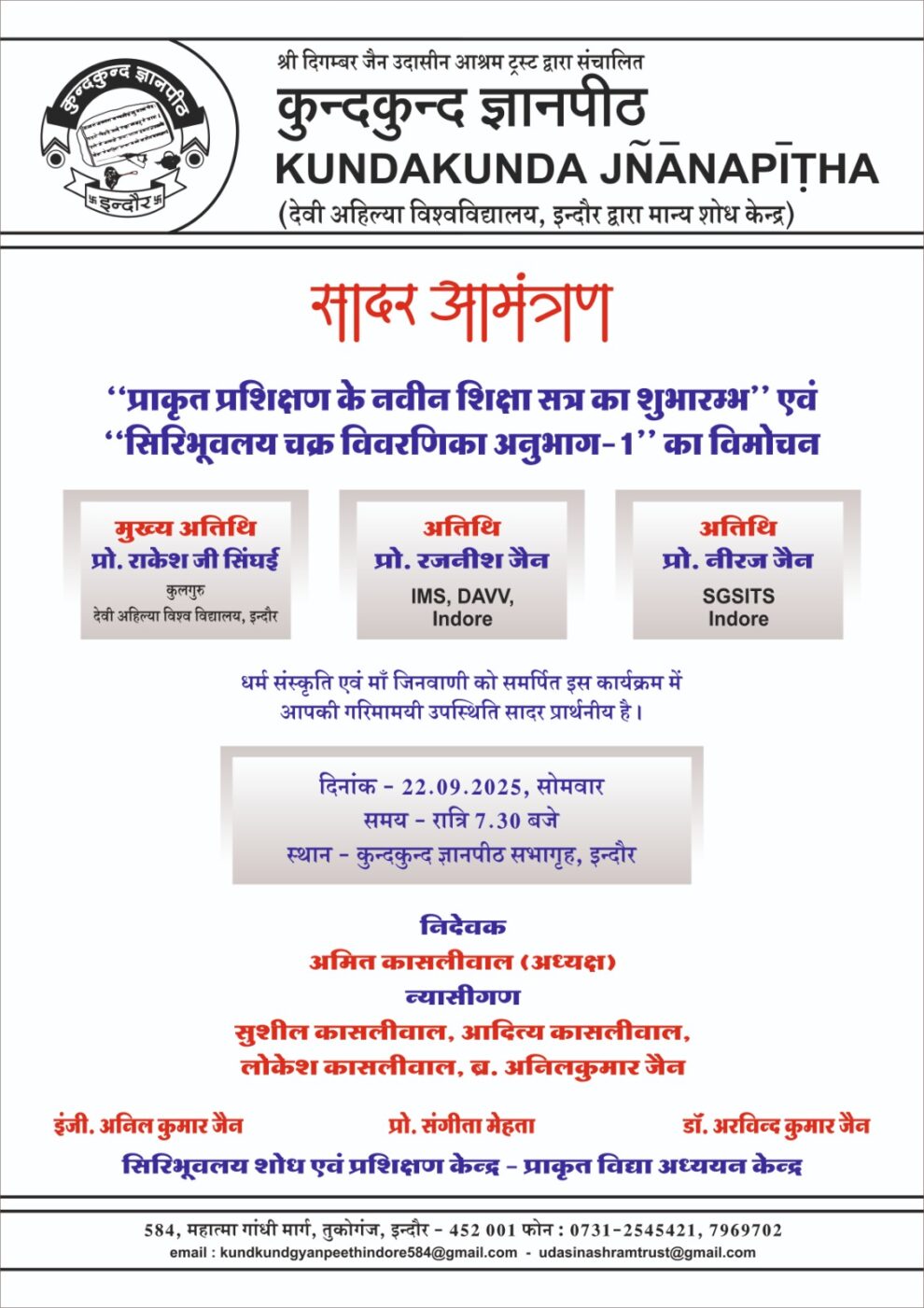 इंदौर। दिगंबर जैन उदासीन आश्रम ट्रस्ट द्वारा संचालित कुंदकुंद ज्ञानपीठ के अंतर्गत प्राकृत विद्या अध्ययन केंद्र एवं सिरिभूवलय शोध एवं प्रशिक्षण केंद्र के द्वारा प्राकृत भाषा के प्रशिक्षण हेतु नवीन सत्र का शुभारंभ सोमवार, 22 सितंबर को संध्या 7:30 बजे किया जाएगा। यह आयोजन एमजी रोड स्थित कुंदकुंद ज्ञानपीठ के सभागृह में संपन्न होगा।