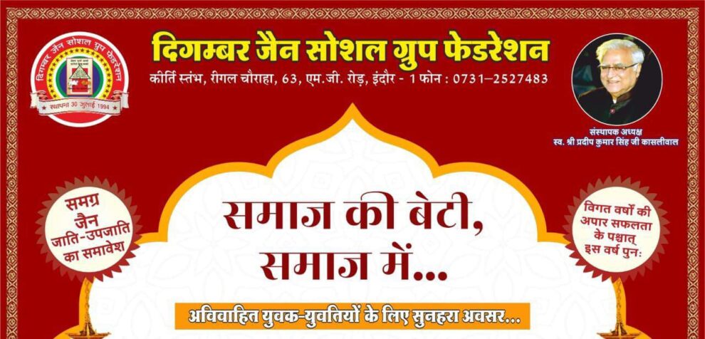 31 वर्षों से स्थापित दिगंबर जैन समाज की सबसे सक्रिय और क्रियाशील संस्था दिगंबर जैन सोशल ग्रुप फेडरेशन के तत्वावधान में इस वर्ष तृतीय युवक-युवती परिचय सम्मेलन आयोजित किया जा रहा है। अंतरराष्ट्रीय जैन युवक-युवती परिचय सम्मेलन 25 जनवरी 2026 को दस्तूर गार्डन में रखा गया है। इसमें समाज के सभी लोग भाग लेंगे। इंदौर से पढ़िए, यह खबर…
