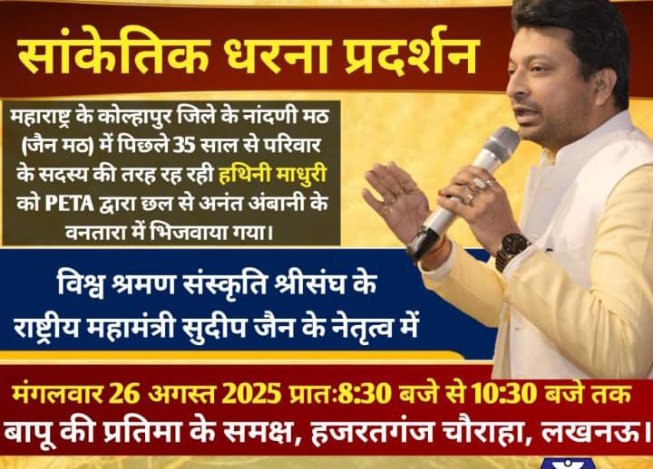 लखनऊ। महाराष्ट्र के कोल्हापुर जिले के नांदणी मठ (जैन मठ) में पिछले 35 साल से परिवार के सदस्य की तरह रह रही हथिनी माधुरी को पेटा द्वारा छल से अनंत अंबानी के वनतारा में भिजवाया गया। इसका सकल जैन समाज विरोध करता है। इतना ही नहीं माधुरी को वनतारा से वापस नांदणी मठ लाने के समर्थन में मंगलवार 26 अगस्त को प्रातः 8.30 से 10.30 बजे तक विश्व श्रमण संस्कृति श्रीसंघ के राष्ट्रीय महामंत्री सुदीप जैन के नेतृत्व में बापू की प्रतिमा के समक्ष हजरतगंज चौराहा पर सांकेतिक धरना प्रदर्शन किया जाएगा। इसमें सकल जैन समाज के पदाधिकारी, प्रतिनिधि और समाजजन मौजूद रहेंगे।
