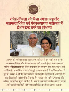 अहमदाबाद । आचार्य श्री वर्धमान सागर महाराज के सानिध्य में 24 सालों बाद हो रहे महामस्तकाभिषेक और पंचकल्याणक महोत्सव में मुंबई-अहमदाबाद के राजेश- विमला शाह को ईशान इन्द्र बनने का सौभाग्य प्राप्त हुआ। राजेश कई धार्मिक और सामाजिक संस्थाओं से जुड़े है।