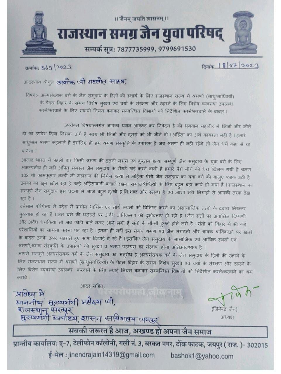 राजस्थान समग्र जैन युवा परिषद् के अध्यक्ष जिनेन्द्र जैन ने अल्पसंख्यक वर्ग के जैन समुदाय के हितों की रक्षार्थ के लिए सम्पूर्ण राजस्थान राज्य में श्रमणों (साधु/साध्वियों) के पैदल विहार के समय विशेष सुरक्षा एवं चर्या के संरक्षण और ठहरने के लिए विशेष व्यवस्था उपलब्ध करवाने के लिए स्थायी नियम बनाकर सम्बंधित विभागों को निर्देशित करने के लिए मुख्यमंत्री अशोक गहलोत को पत्र लिखकर समुदाय के युवा वर्ग की भावनाओं से अवगत कराया। पढ़िए जिनेन्द्र जैन की रिपोर्ट…