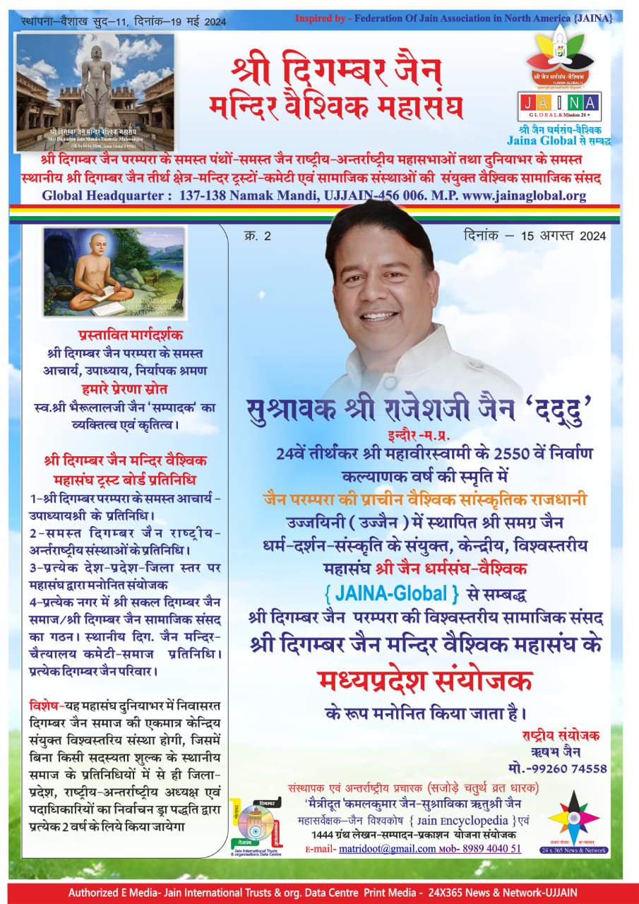 श्री दिगम्बर जैन मन्दिर वैश्विक महासंघ के मध्यप्रदेश संयोजक के रूप में राजेशजी जैन ‘दद्दू‘, इन्दौर का मनोनयन महासंघ के राष्ट्रीय संयोजक ऋषभजी जैन तथा संस्थापक अंतरराष्ट्रीय संयोजक ‘मैत्रीदूत‘ कमलकुमार जैन द्वारा किया गया है। श्री दिगम्बर जैन परम्परा के समस्त पंथों-समस्त जैन राष्ट्रीय-अंतरराष्ट्रीय महासभाओं तथा दुनियाभर में संचालित समस्त स्थानीय श्री दिगम्बर जैन तीर्थ क्षेत्र-मन्दिर ट्रस्टों-कमेटी एवं सामाजिक संस्थाओं की संयुक्त दिगम्बर जैन वैश्विक सामाजिक संसद के रूप मे ‘ श्री दिगम्बर जैन मन्दिर वैश्विक महासंघ‘ की उद्घोषणा की गई है। पढ़िए यह विशेष रिपोर्ट…