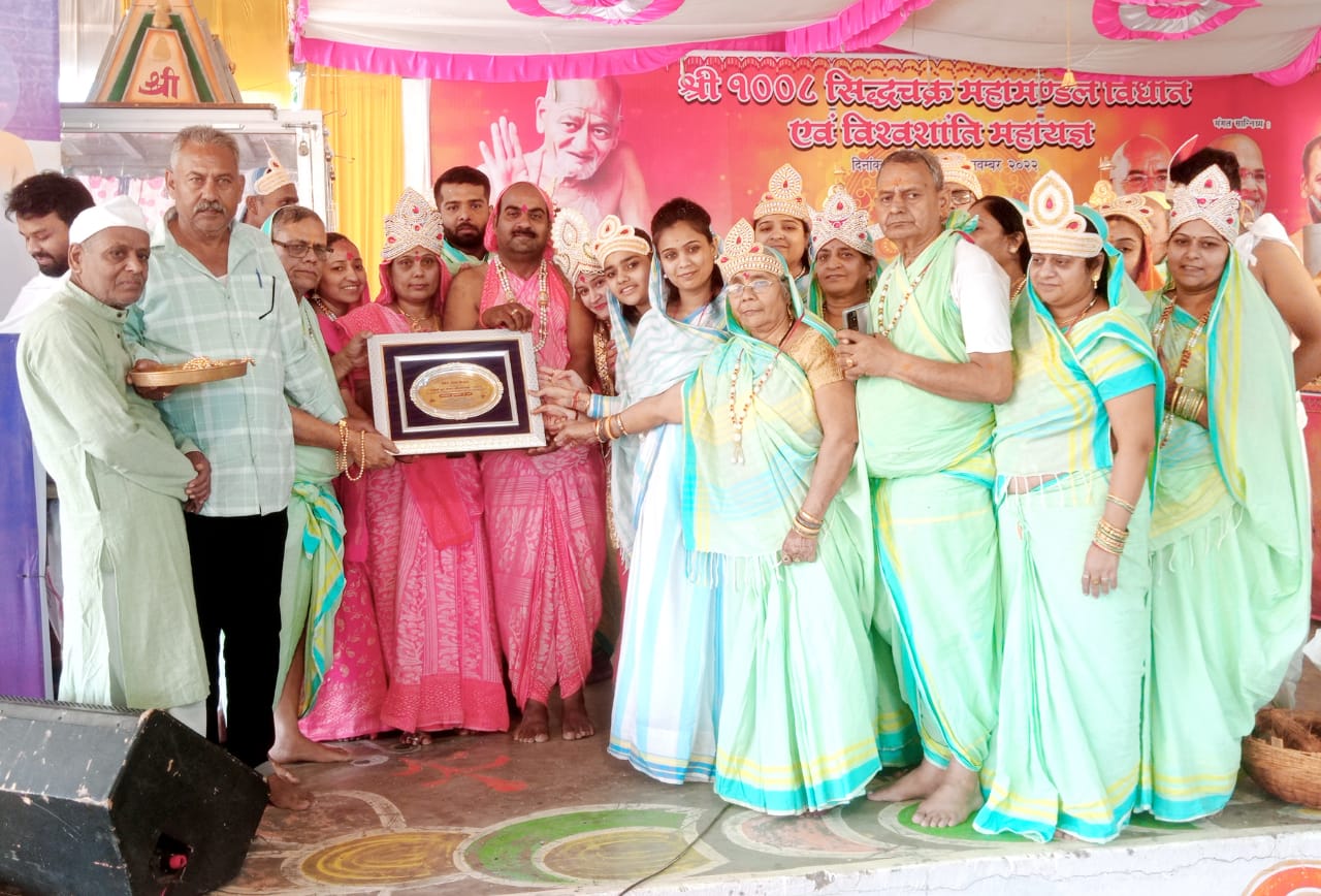 मड़ावरा(ललितपुर,प्रियंक सर्राफ)। पूज्य संत गणेश प्रसाद जी वर्णी व ग्यारह भव्य जैन मंदिरों की नगरी मड़ावरा में मुनि अभय सागर, मुनि प्रभात सागर, मुनि निरीह सागर जी के पावन सानिध्य एवं बाल ब्रम्हचारी मनोज भैया ललितपुर के निर्देशन में श्री सिद्धचक्र महामण्डल विधान का विश्वशांति की कामना के साथ महायज्ञ में पूर्णाहुति देकर समापन किया गया। विधान पुण्यार्जक विमलेश कुमार, संतोष कुमार बजाज परिवार के सौजन्य से विधान बीते एक नवंबर से आरम्भ हुआ था। इस दौरान श्रीजी की प्रतिमा को काष्ठ रथ पर विराजमान कर सम्पूर्ण नगर की परिक्रमा की गई।